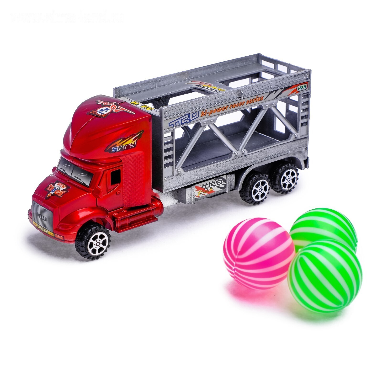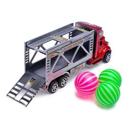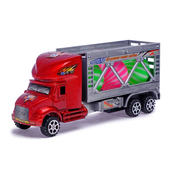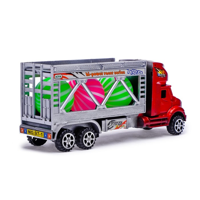 В кузове тягача находятся 3 разноцветных мяча. Если мальчишке надоест управлять им, он с удовольствием поиграет с шарами или установит их в качестве препятствий для машины.