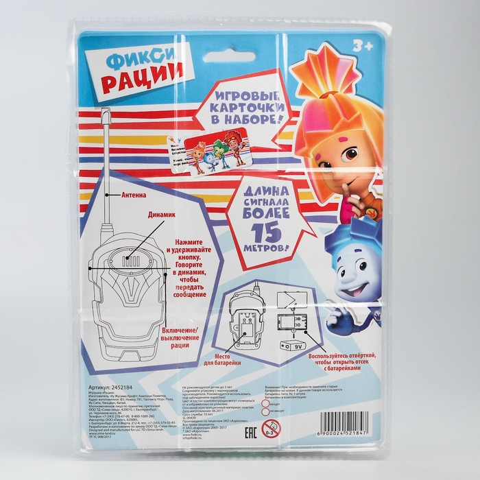 <h2 class="h4">Задание для настоящего сыщика! </h2><p>Юным героям предстоит выполнить операцию по спасению мира? Тогда им просто необходимо постоянно поддерживать связь друг с другом, чтобы всегда быть в курсе событий. </p><p>С рациями торговой марки Фиксики маленькие суперагенты станут отважными и неуловимыми и победят всех врагов.</p><h2 class="h4">Как пользоваться рацией </h2><p>Вставьте в устройство 1 батарейку типа 9 V, нажмите на кнопку и удерживайте её. Начните говорить в динамик, и ваш голос будет воспроизводиться в другой рации. Отпустите кнопку, чтобы услышать, что вам ответят. Благодаря антенне длина сигнала достигает 20 метров. </p><p>В наборе вы найдёте игровые карточки и увлекательное супершпионское задание. </p><h2 class="h4">Развиваемся играя! </h2><p>С помощью раций дети придумают интересные сюжетно-ролевые игры, разовьют фантазию, воображение, логическое мышление. </p><p>Товар предназначен для детей старше 3 лет. </p>