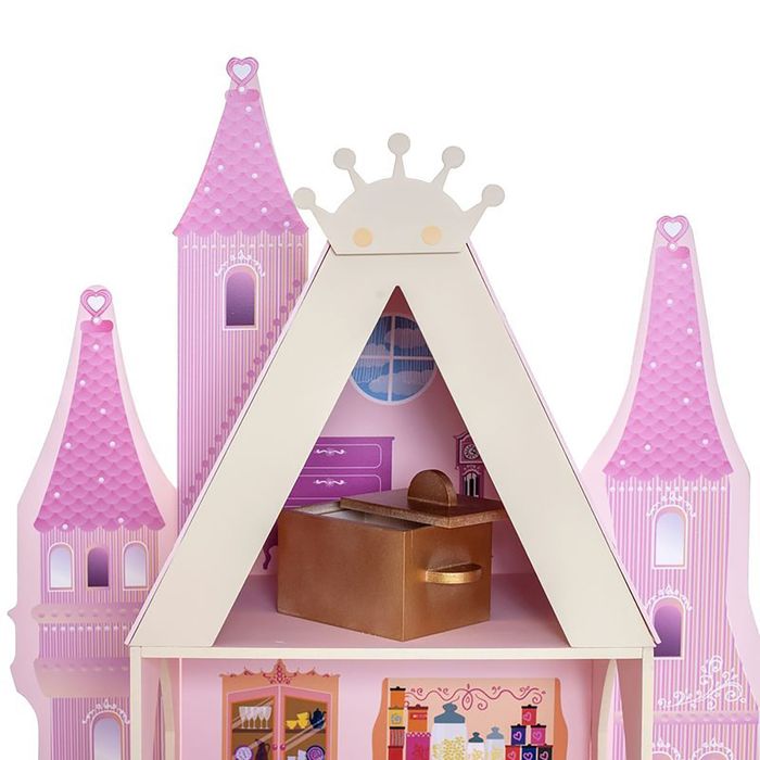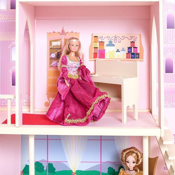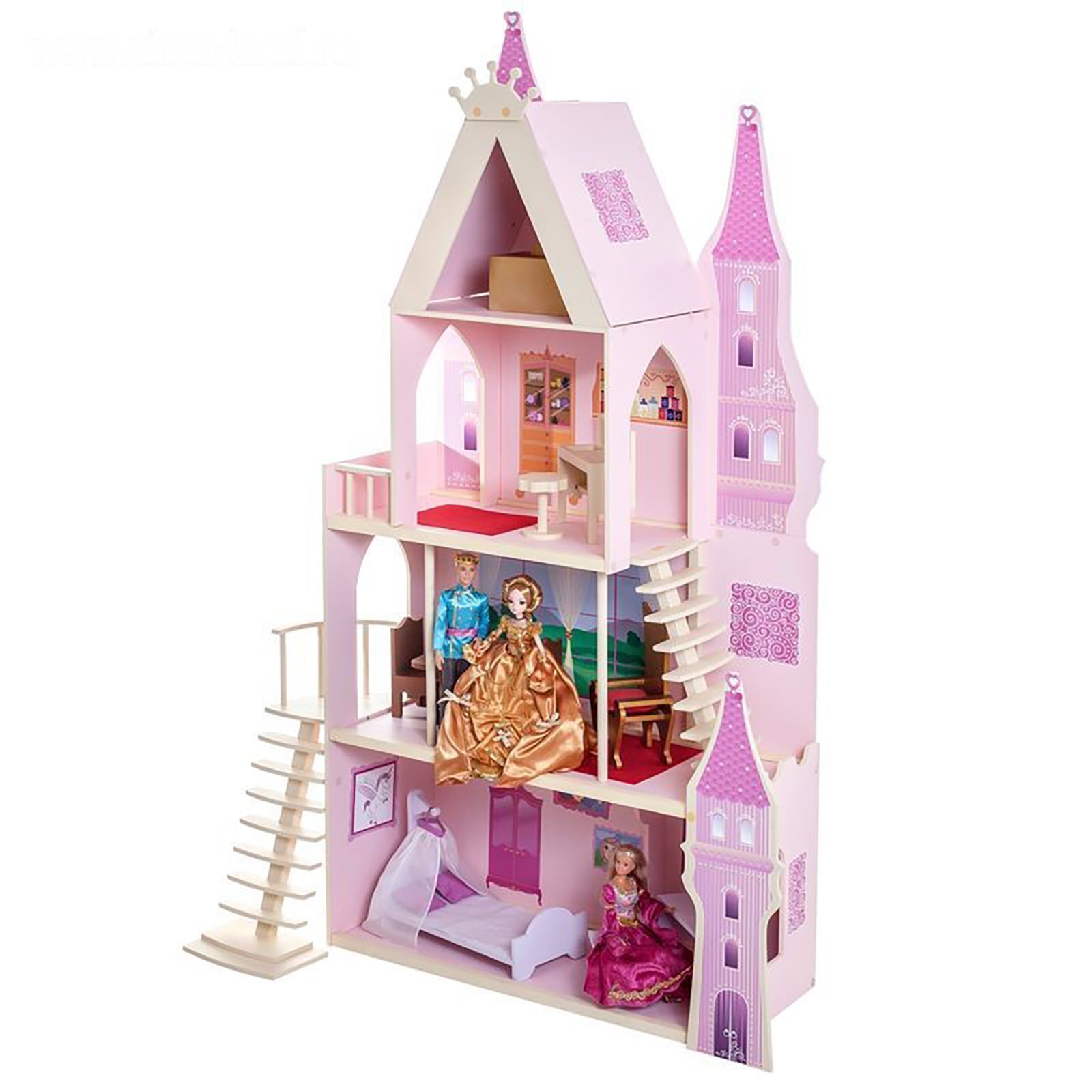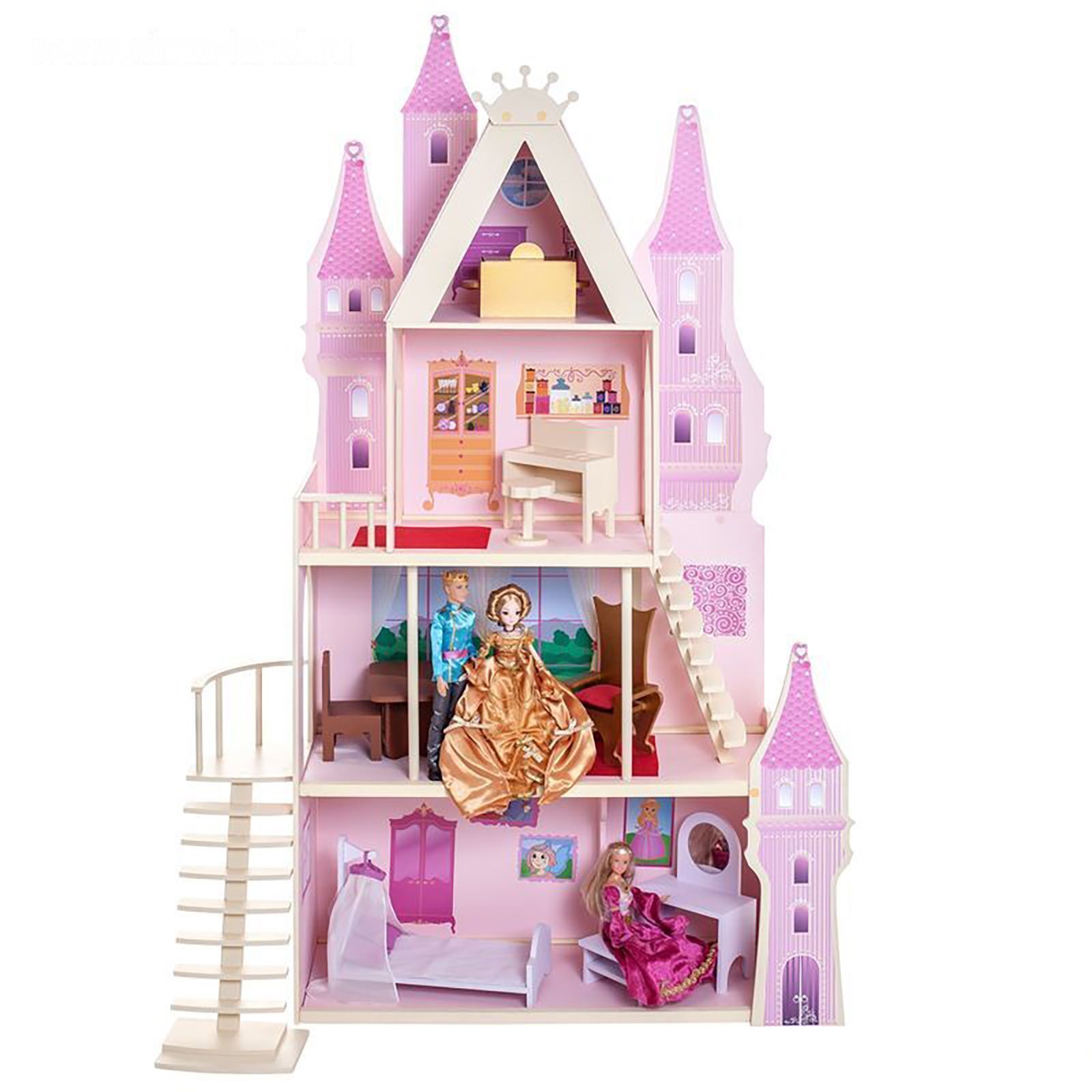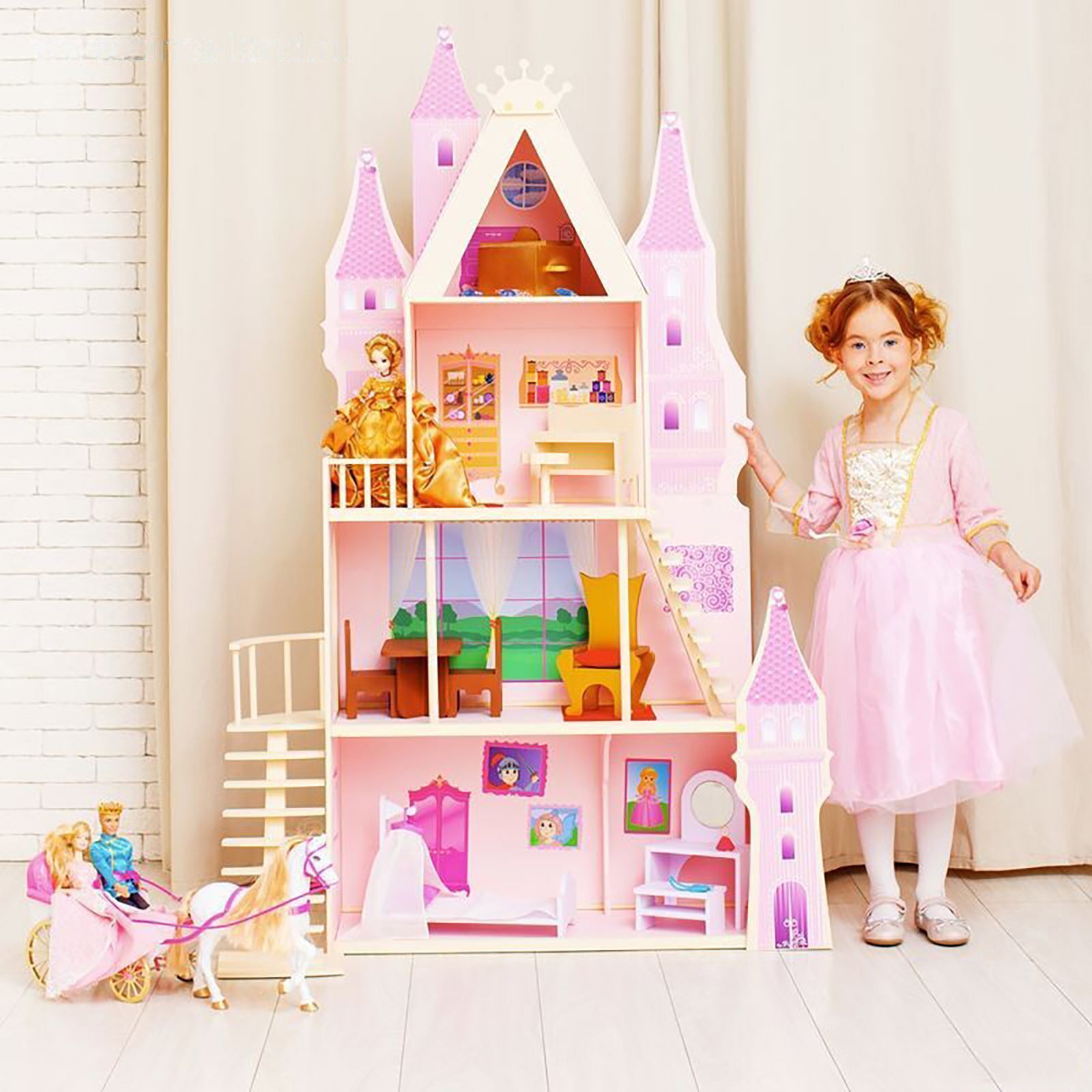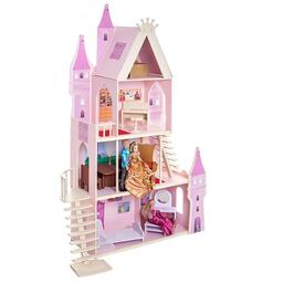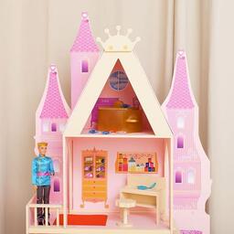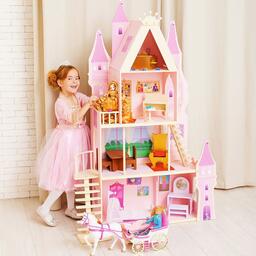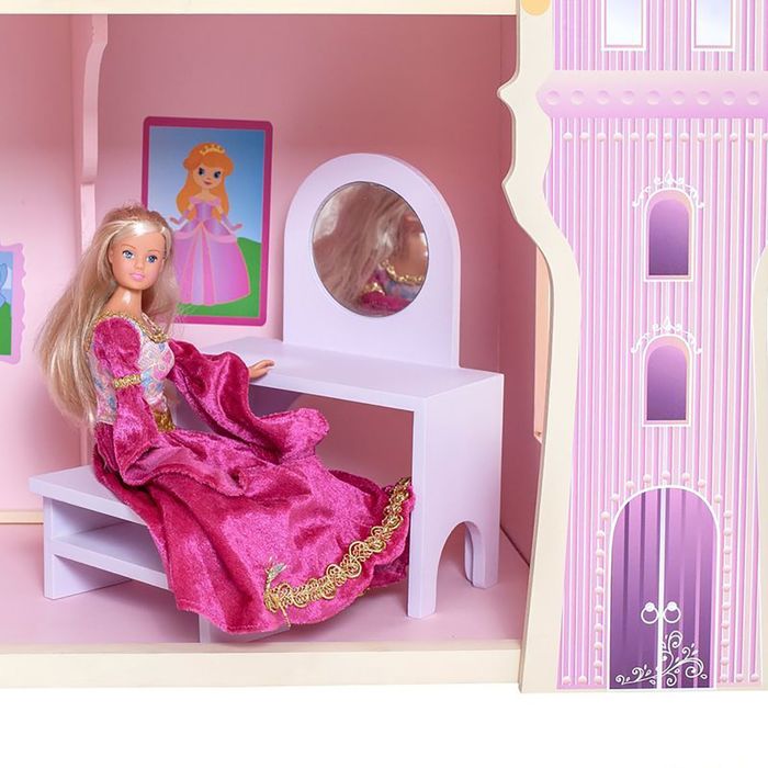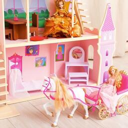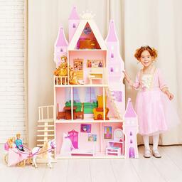 <p>У игрушечного дворца четыре этажа и частично открытая конструкция, поэтому ребёнку доступны все зоны с лицевой стороны, также есть 2 лестницы. Кукольное жилище декорировано и укомплектовано, поэтому малыш приступит к игре сразу после его сборки.</p><p>Дочурка поселит в волшебный замок принцессу и будет воспроизводить сюжеты из любимых сказок или создавать свои истории.</p> <p>В наборе также есть 16 предметов мебели, текстиль и декоративные наклейки для украшения интерьера.</p><p>Куклы, карета и питомцы в комплект не входят.</p>