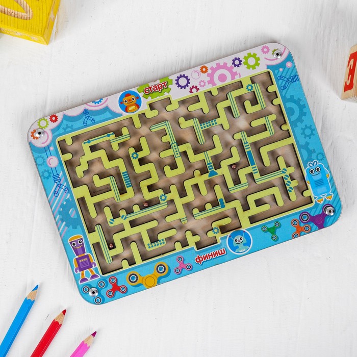 Лабиринт — занимательная развивающая игрушка для любознательных малышей. Представляет собой планшет с яркими изображениями и замысловатыми дорожками, на которых расположены подвижные металлические шарики.