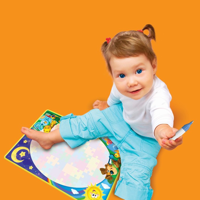 <p>Коврик для рисования водой – один из лучших способов развить творческий потенциал вашего ребенка!</p><p>На таком красочном коврике можно рисовать как волшебным фломастером, который входит в комплект, так и обычными кисточками, мокрыми ручками и ножками.</p><p>Волшебный фломастер нужно наполнить обычной водой из-под крана. В процессе рисования на белом поле коврика проявляются красочные картинки, в течение 5–7 минут все рисунки исчезают, и можно рисовать снова и снова.</p><p>Даже самые маленькие художники с помощью такого чудо-коврика могут нарисовать свои первые шедевры. При этом руки и одежда Вашего малыша всегда будут оставаться чистыми!</p><p>В увлекательном творческом процессе Ваш малыш познакомится с алфавитом, цифрами, геометрическими фигурами и миром животных.</p>