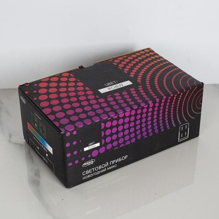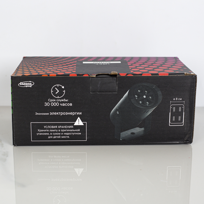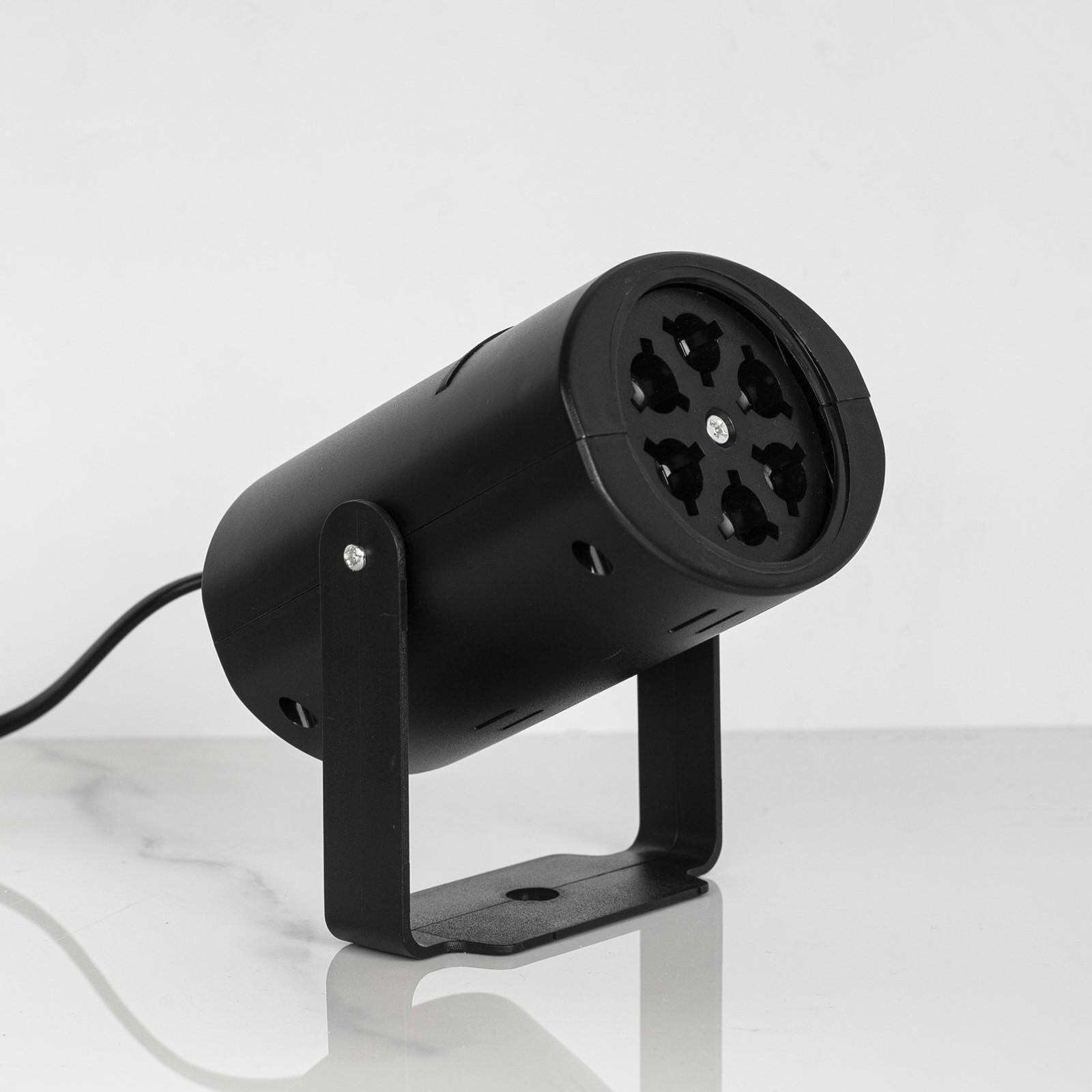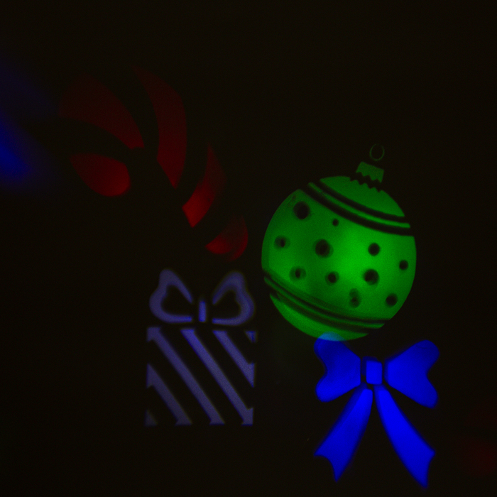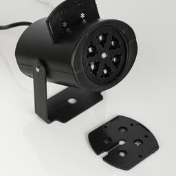 Прибор «Снежинки» создаёт световые эффекты. Лучи проходят через картридж (в комплекте 2 штуки) и отверстия на устройстве и проецируют разноцветные картинки на поверхность. Работает от сети, можно поставить на пол, стол или повесить на потолок, стену. Оснащён поворотным механизмом, чтобы направлять лучи.