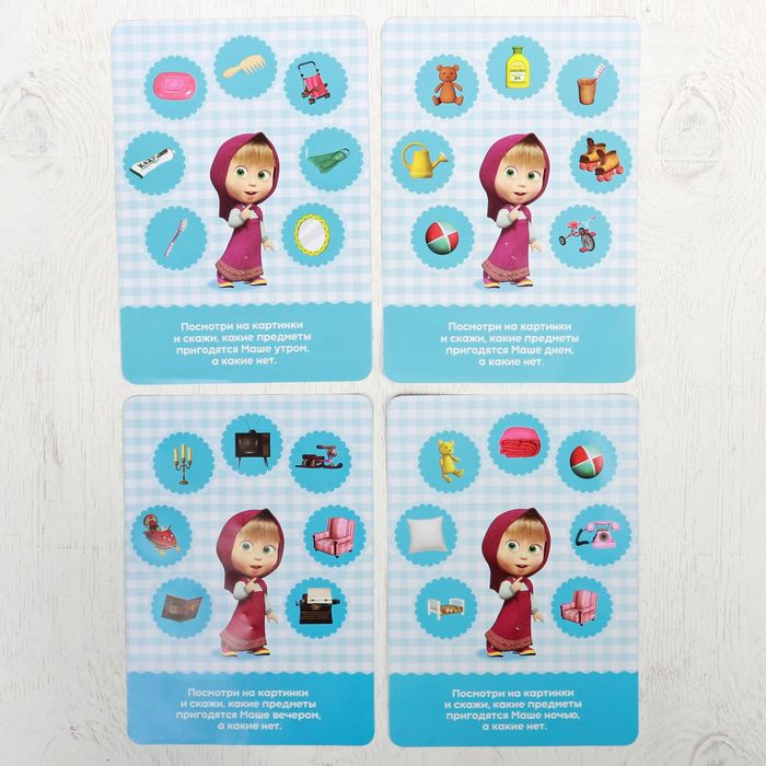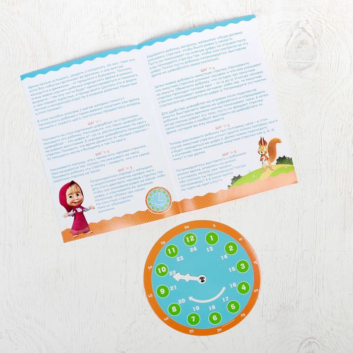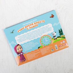 <h2 class="h4"> Изучаем время вместе с Машей!</h2><p>Вы значительно облегчите жизнь своему ребёнку, если перед школой научите его не только читать и писать, но и ориентироваться во времени, пользоваться часами. Чем раньше у малыша сформируется это полезное умение, тем лучше. </p><p>Однако каждому родителю известно, что заставить карапуза заниматься — задачка не из простых. Выход один: покажите ему, как определять время в форме лёгкой и интересной игры! В этом вам поможет девочка Маша.</p><h2 class="h4">Что нужно делать?</h2><p>Вращайте стрелки часов, выполняйте различные задания и знакомьтесь с временами суток. Подробное дидактическое пособие и красочные листочки с упражнениями сделают процесс увлекательным. </p><h2 class="h4"> Внутри вы найдёте:</h2><ul><li>картонный циферблат со стрелками;</li><li>4 листочка с временами суток; </li><li>пособие для родителей.</li></ul><h2 class="h4">Играем и развиваемся вместе с любимыми героями!</h2>