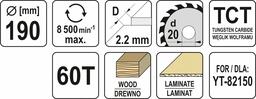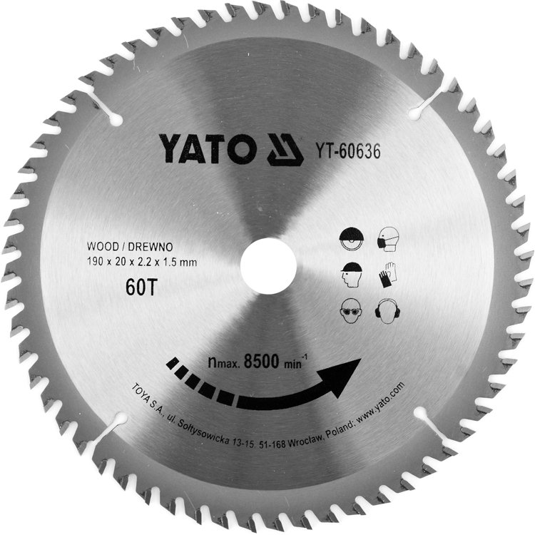Диск пильный по дереву с победитовыми напайками Yato YT-60636 (190x20x2.2x1.5 мм), 60 зубцов
