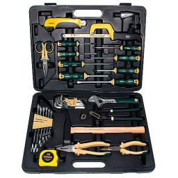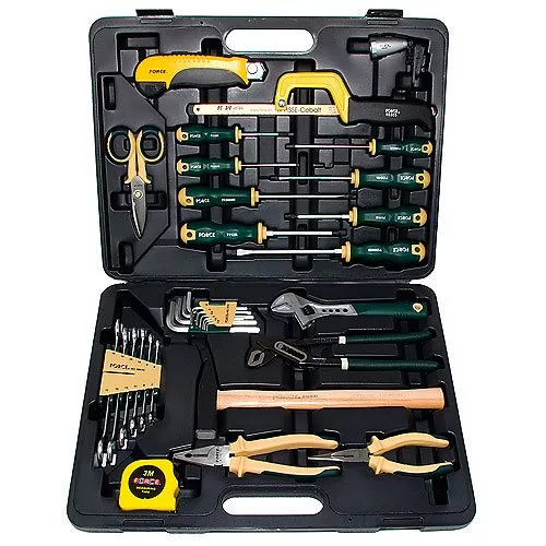 Универсальный набор инструмента, состоящий из 34 предметов. Набор в пластиковом кейсе. В набор входят: 6 рожковых ключей: 6x7, 8x9, 10x11, 12x13, 14x15, 16x17 мм; 10 шестигранных угловых ключей: 1.27, 1.5, 2, 2.5, 3, 4, 5, 6, 8, 10 мм; 3 отвертки крестовые (PHILLIPS): PH0x60, PH1x80, PH2x100 мм; 5 отверток шлицевых (SLOTTED): 3x75, 3.5x100, 4x100, 5.5x125, 6.5x150 мм; молоток 300 гр; пассатижи комбинированные; переставные клещи 250 мм; длинногубцы 150 мм; рулетка 3 м; разводной ключ (0-28 мм.) 200 мм; канцелярский нож (включает в себя 2 сменных лезвия); технические ножницы; мини-ножовка; переносная миниатюрная лампа белого света на клипсе с поворотом на 360 градусов..