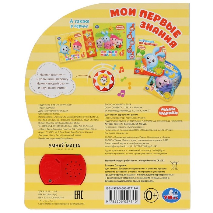 <p>Книга «Мои первые знания», 1 музыкальная кнопка, 10 песенок, 10 стр. — отличный вариант для тех родителей, которые привыкли окружать своего малыша только лучшими и качественными вещами. За такой книжкой ваш ребёнок проведёт время с пользой и удовольствием, узнает много нового и интересного.</p>