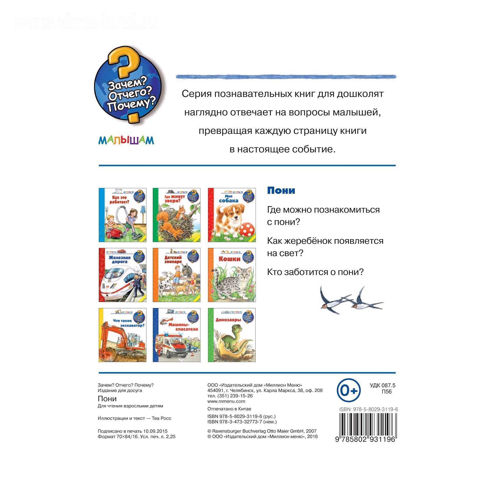 Серия познавательных книг для дошколят наглядно отвечает на вопросы малышей, превращая каждую страницу книги в настоящее событие. Где можно познакомиться с пони? Как жеребёнок появляется на свет? Кто заботится о пони?