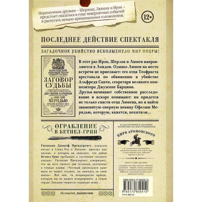 <p>В этот раз Ирэн, Шерлок и Люпен направляются в Лондон. Однако Люпен на место встречи не приезжает: его отца Теофраста арестовали по обвинению в убийстве Альфреда Санти, секретаря великого композитора Джузеппе Барцини. Друзья начинают собственное расследование и вскоре понимают: им придется не только спасти отца Люпена, но и найти знаменитую оперную певицу Офелию Меридью, которую, кажется, похитили…</p>