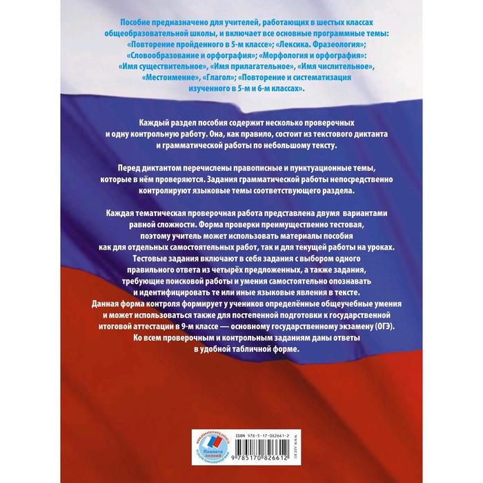 <p>Пособие адресовано учителям, работающим в 5 классе общеобразовательной школы, пятиклассникам и их родителям и включает все основные темы этого этапа изучения курса русского языка. Каждый раздел пособия содержит несколько проверочных и одну контрольную работу. Проверочные работы представлены двумя вариантами равной сложности. Контрольные работы состоят из текстового диктанта и грамматической работы по небольшому тексту. Форма проверки материала тестовая, в формате ГИА. В конце книги даны ответы ко всем заданиям. Тесты. </p>