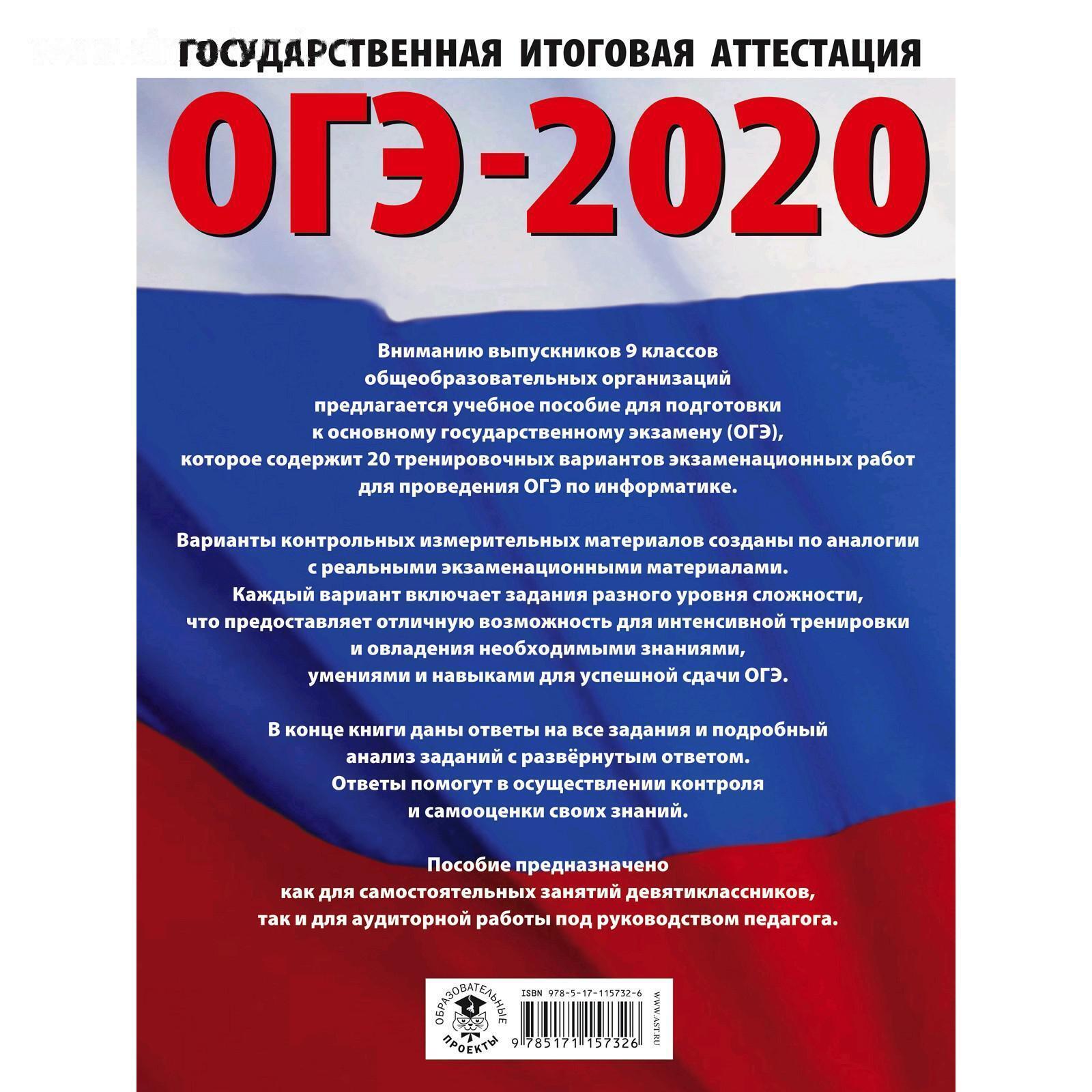 <p>20 вариантов экзаменационных работ по информатике — пособие для учащихся 9 классов, позволяющее в кратчайшие сроки успешно подготовиться к сдаче основного государственного экзамена. Каждый вариант составлен в полном соответствии с требованиями государственной итоговой аттестации, включает задания разных типов и уровней сложности по основным разделам курса информатики. </p><p> Структура всех вариантов едина. Каждый из них состоит из 2-х частей и включает 20 заданий. </p><p> В конце книги даны ответы на все задания и подробный анализ заданий с развёрнутым ответом с критериями оценки. </p><p> Материалы сборника могут быть использованы для планомерного повторения изученного материала и тренировки в выполнении заданий различного типа при подготовке к экзамену. </p>