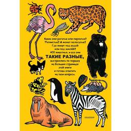 Эта удивительная книга большого формата содержит более 400 рисунков разных животных -- больших и маленьких, пятнистых и полосатых, живущих на деревьях, под землей и под водой. Маленький хамелеон, который поселился на страницах этой книги, будет сопровождать читателя до коротеньких рассказов об этих животных в самом конце книги (нужно поискать его, ведь он меняет окраску! ).