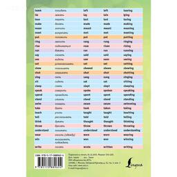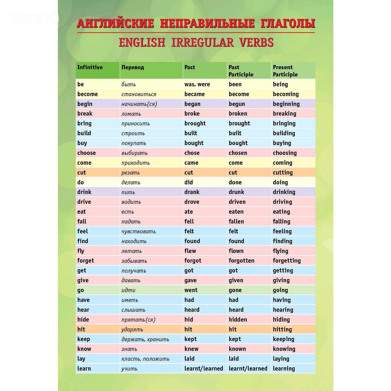 Перед вами яркая многоцветная таблица «Английские неправильные глаголы». В таблице представлены более 60 неправильных глаголов английского языка. Глаголы с похожим способом образования форм выделены одинаковыми цветами. Кроме форм прошедшего времени и причастий прошедшего времени, даются формы причастий настоящего времени.