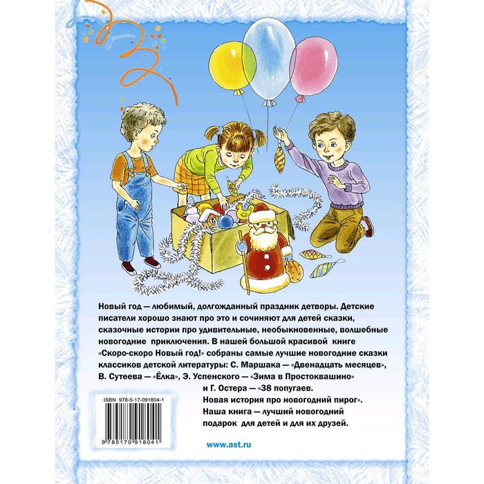 <p>Новый год – любимый, долгожданный праздник детворы. Детские писатели хорошо знают про это и сочиняют для детей сказки, сказочные истории про удивительные, необыкновенные, волшебные новогодние приключения. В нашей большой красивой книге «Скоро-скоро Новый год!» собраны самые лучшие новогодние сказки классиков детской литературы С. Маршака «Двенадцать месяцев», В. Сутеева «Ёлка», Э. Успенского «Зима в Простоквашино» и Г. Остера «38 попугаев. Новая история про новогодний пирог». Наша книга – лучший новогодний подарок для детей и для их друзей. </p><p> Для дошкольного возраста.</p>