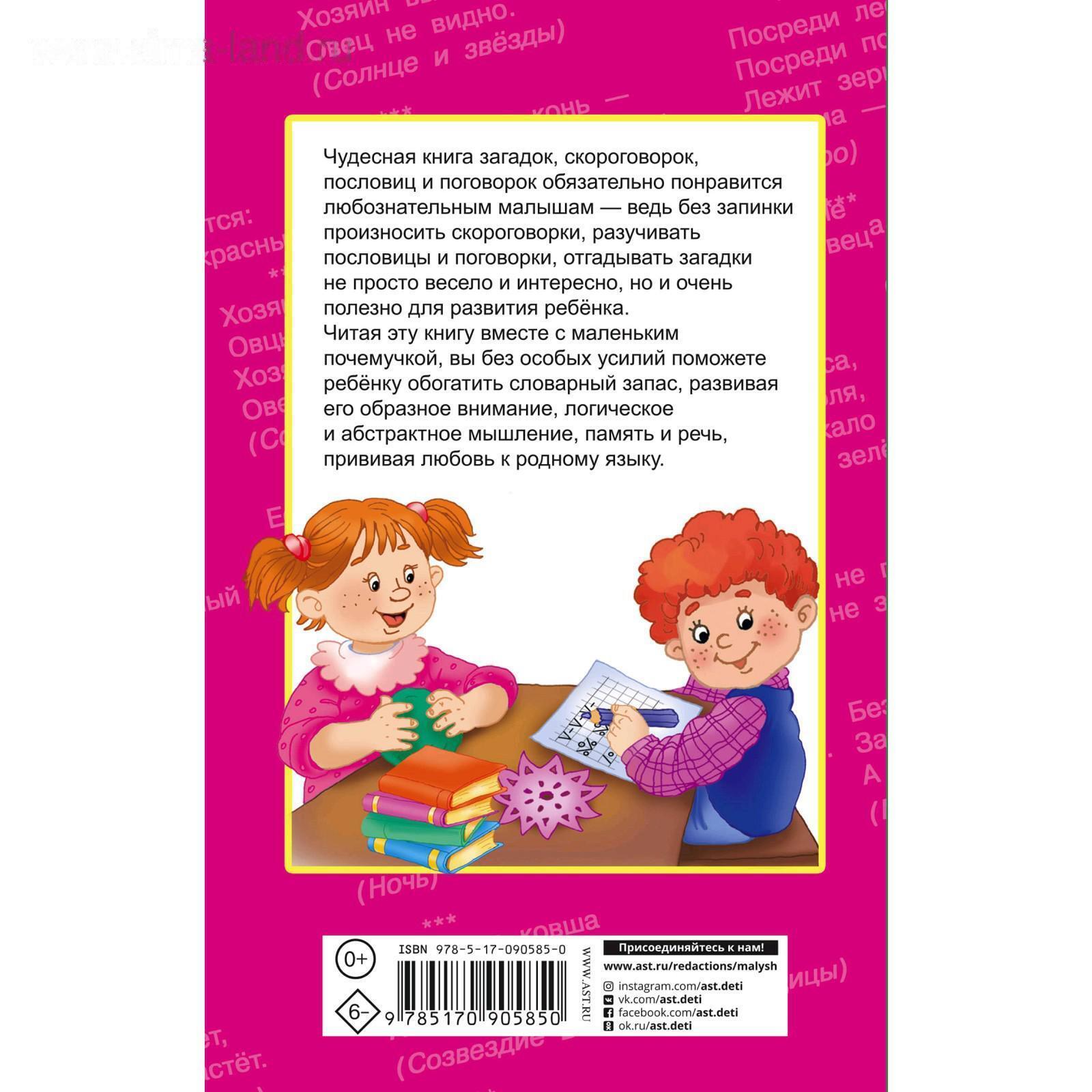 Разучивание скороговорок, пословиц и поговорок, разгадывание загадок — лучший способ развить речь, память внимание и способность ребёнка к обучению. Читайте вместе с малышом книгу «Загадки, скороговорки, пословицы и поговорки», так вы сможете провести обучение в игровой форме: дошкольник с удовольствием будет повторять слова народной мудрости, развивая логику, воображение, память, вырабатывая чёткую, выразительную дикцию. Знакомя ребёнка с жанрами устного народного творчества, родители помогут ему вырасти любознательным и общительным.