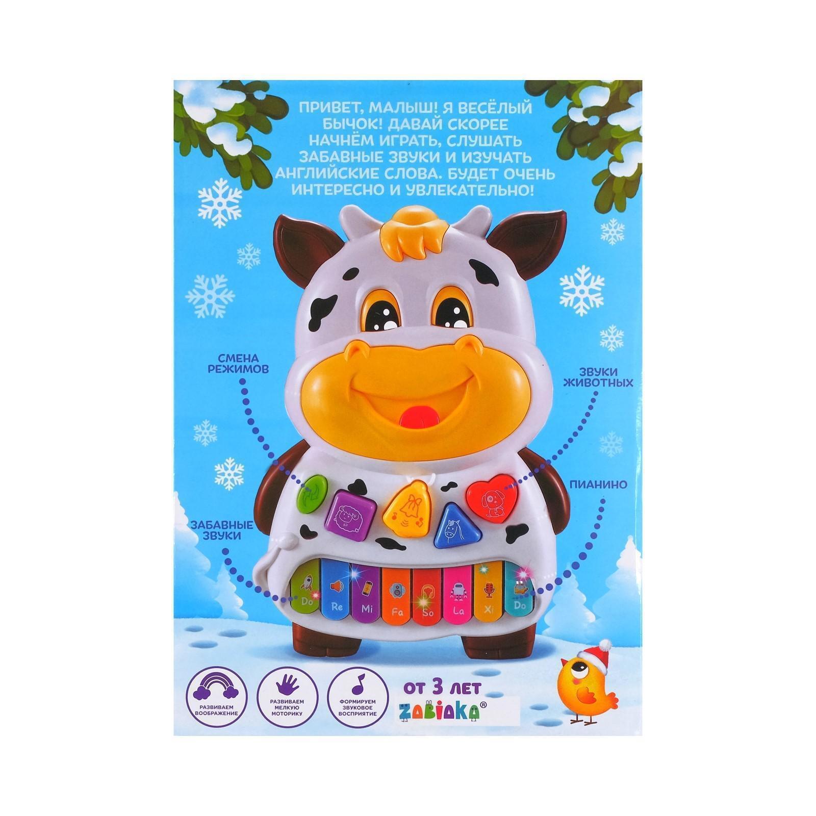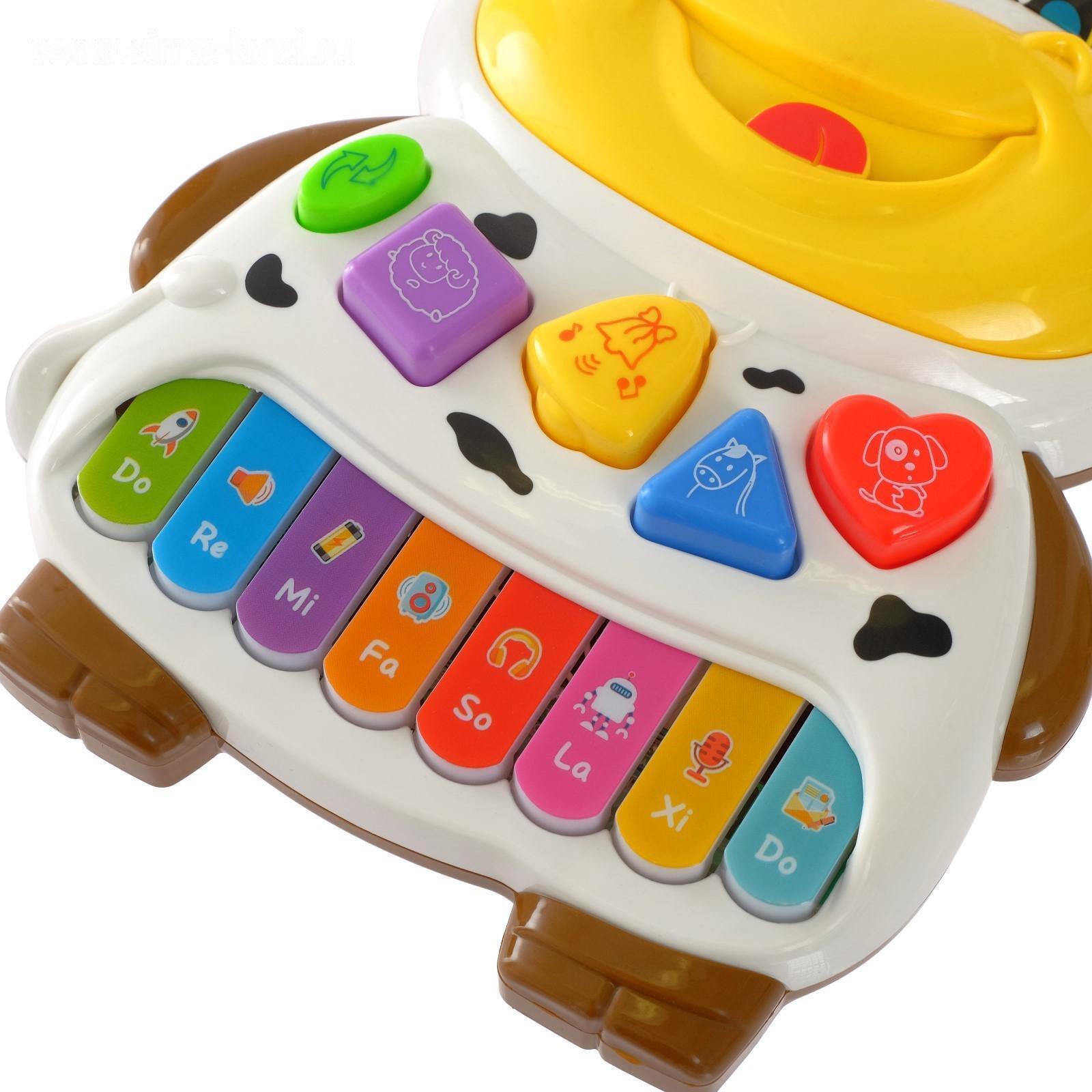 Эта игрушка работает как плеер и пианино. В режиме плеера устройство воспроизводит звуки животных и весёлые мелодии.
