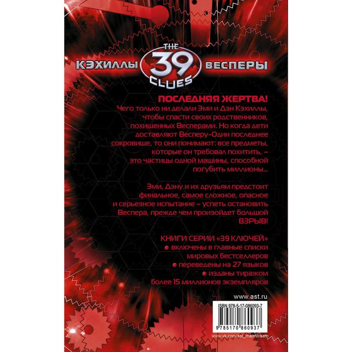 Чего только ни делали Эми и Дэн Кэхиллы, чтобы спасти своих родственников, похищенных Весперами. Но когда дети доставляют Весперу-Один последнее сокровище, то они понимают: все предметы, которые он требовал похитить, - это частицы одной машины, способной погубить миллионы... Эми, Дэну и их друзьям предстоит финальное, самое сложное, опасное и серьезное испытание - успеть остановить Веспера, прежде чем произойдет большой взрыв!