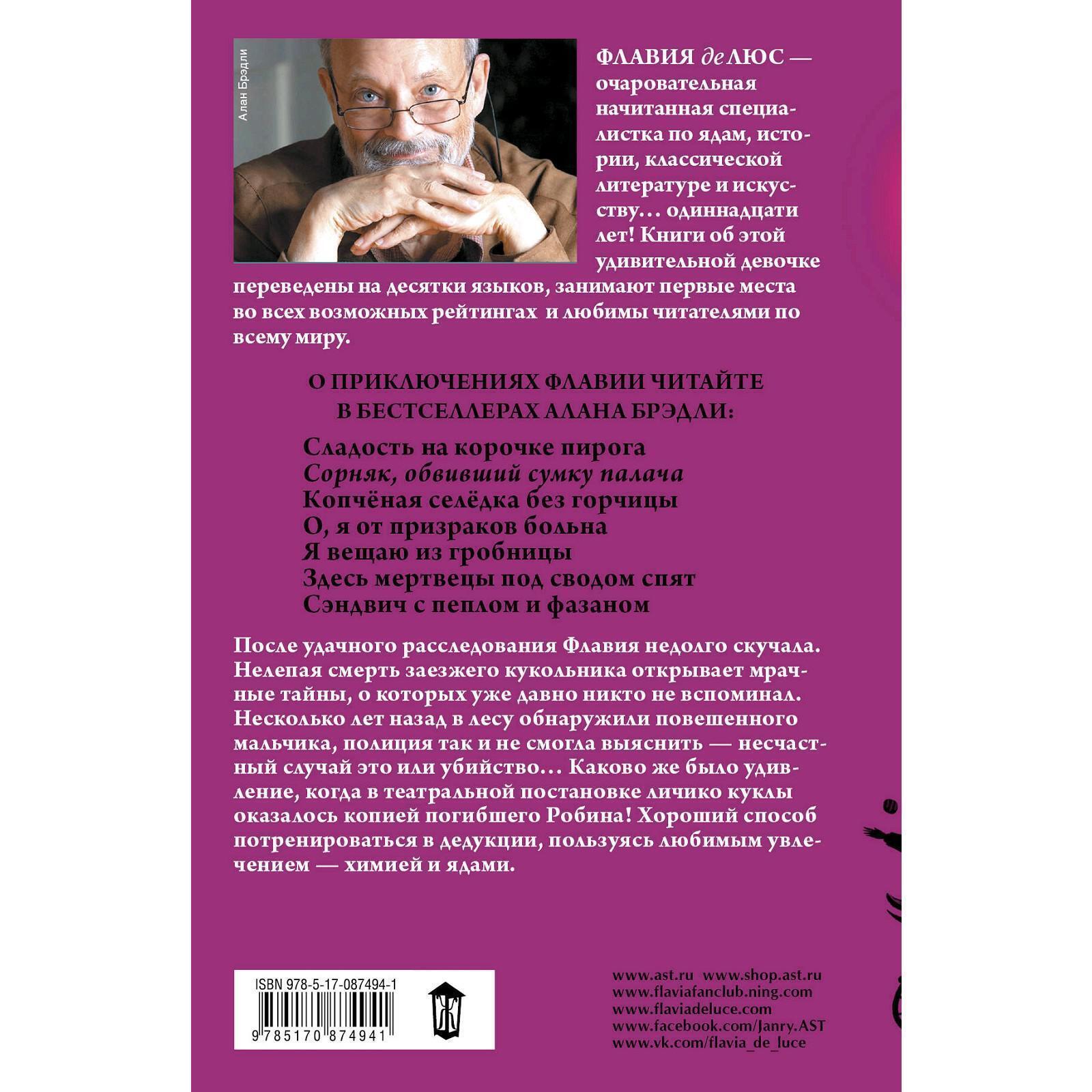 В тихом омуте черти водятся - эта пословица точно характеризует эксцентричную семейку, обитающую в старинном поместье Букшоу. Отец, повернутый на марках, чокнутая тетушка и две сестрицы: ханжа и синий чулок - как прикажете развлекаться юной сыщице в такой компании? Расследование нелепой смерти заезжего кукольника открывает другие мрачные тайны, о которых уже давно никто не вспоминал - отличное время препровождение. Несколько лет назад в лесу обнаружили повешеного мальчика, полиция так и не смогла выяснить, несчастный случай это или убийство … Каково же было удивление, когда в театральной постановке личико куклы оказалось копией погибшего Робина! Хороший способ потренироваться в дедукции, пользуясь любимым увлечение - химией и ядами.