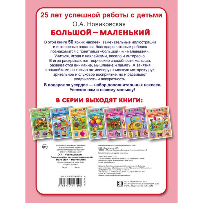 <p>Уникальная методика от логопеда-практика О. А. Новиковской с 25-летним стажем успешной работы с детьми. Ребенок познакомится с понятиями «большой» и «маленький». В книге замечательные иллюстрации, интересные задания и 50 ярких наклеек. Учиться, играя с наклейками, весело и интересно. В игре раскрываются творческие способности малыша, развиваются внимание, мышление и память. А занятия с наклейками не только активизируют тактильное, зрительное и слуховое восприятие, но и развивают усидчивость и аккуратность. </p>