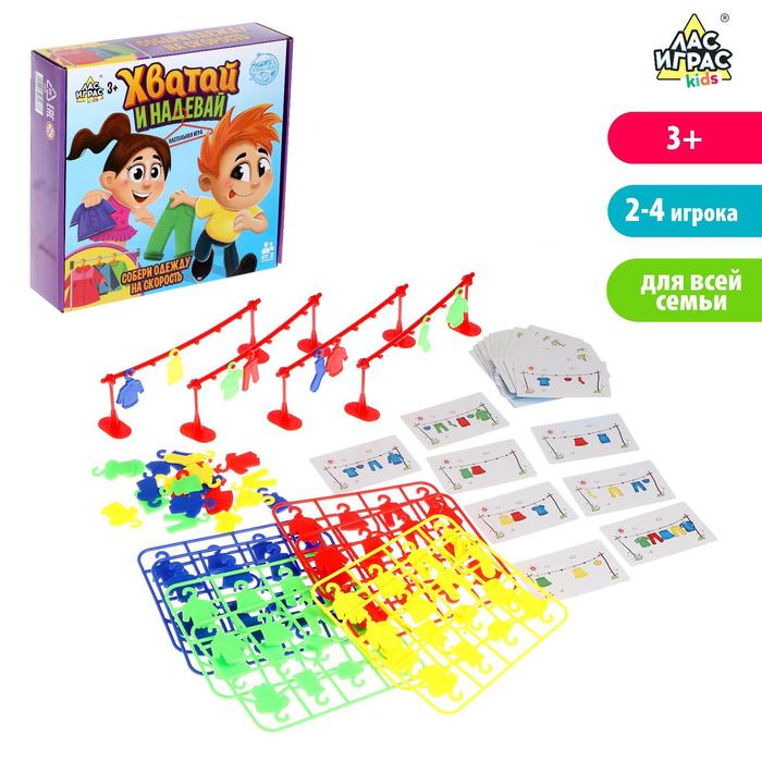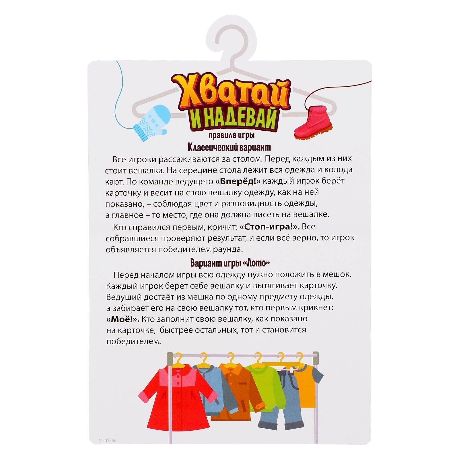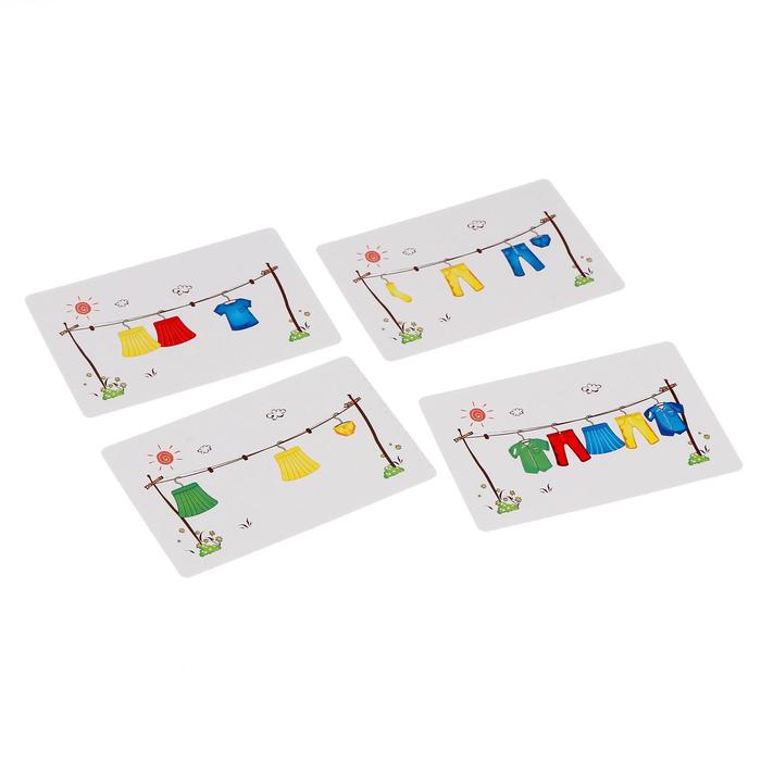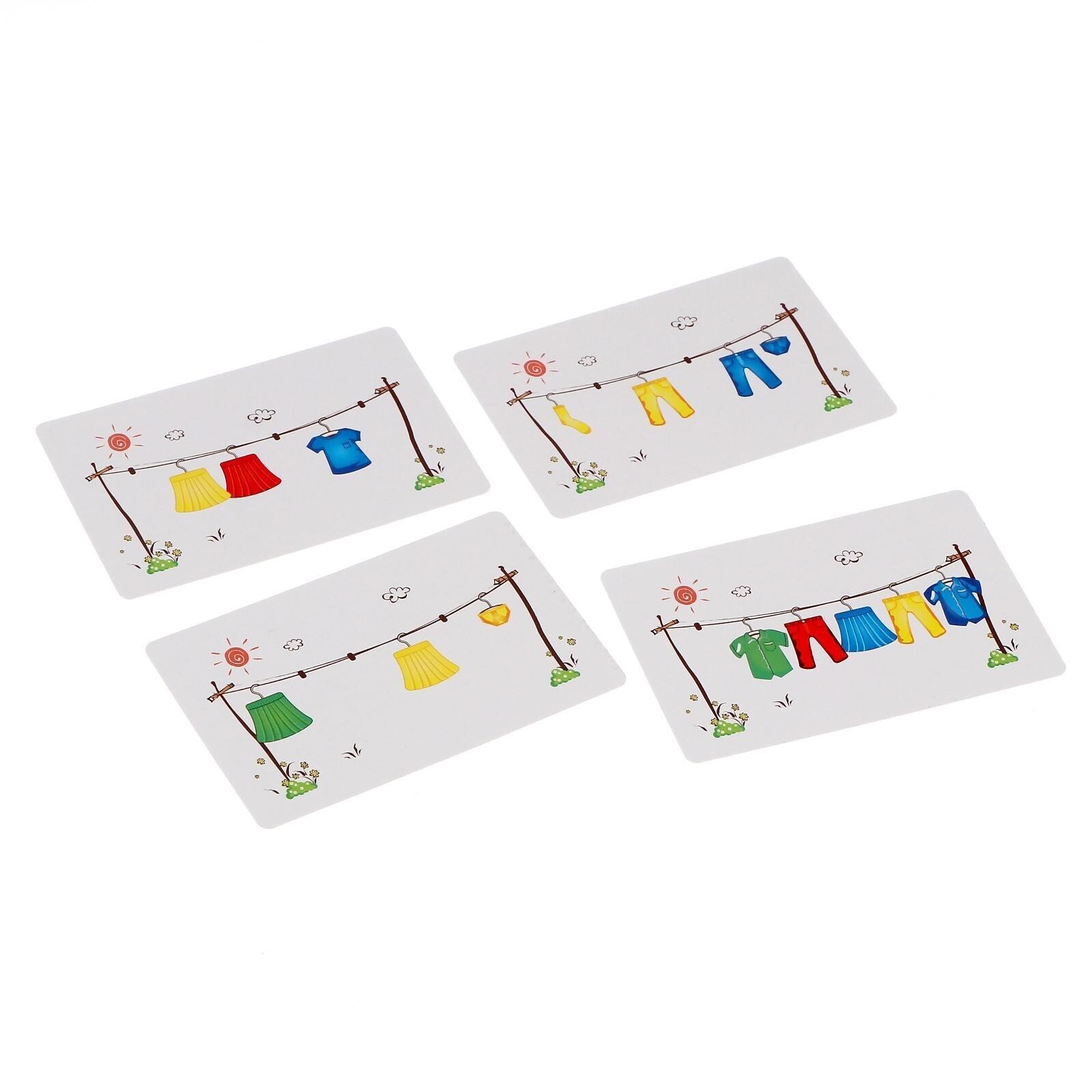 Тяните карточки и развешивайте на своей вешалке нужную одежду. Будьте внимательны! Соблюдайте цвет и разновидность одежды, как показано на карточке. Смотрите на место, где она должна висеть на вешалке.