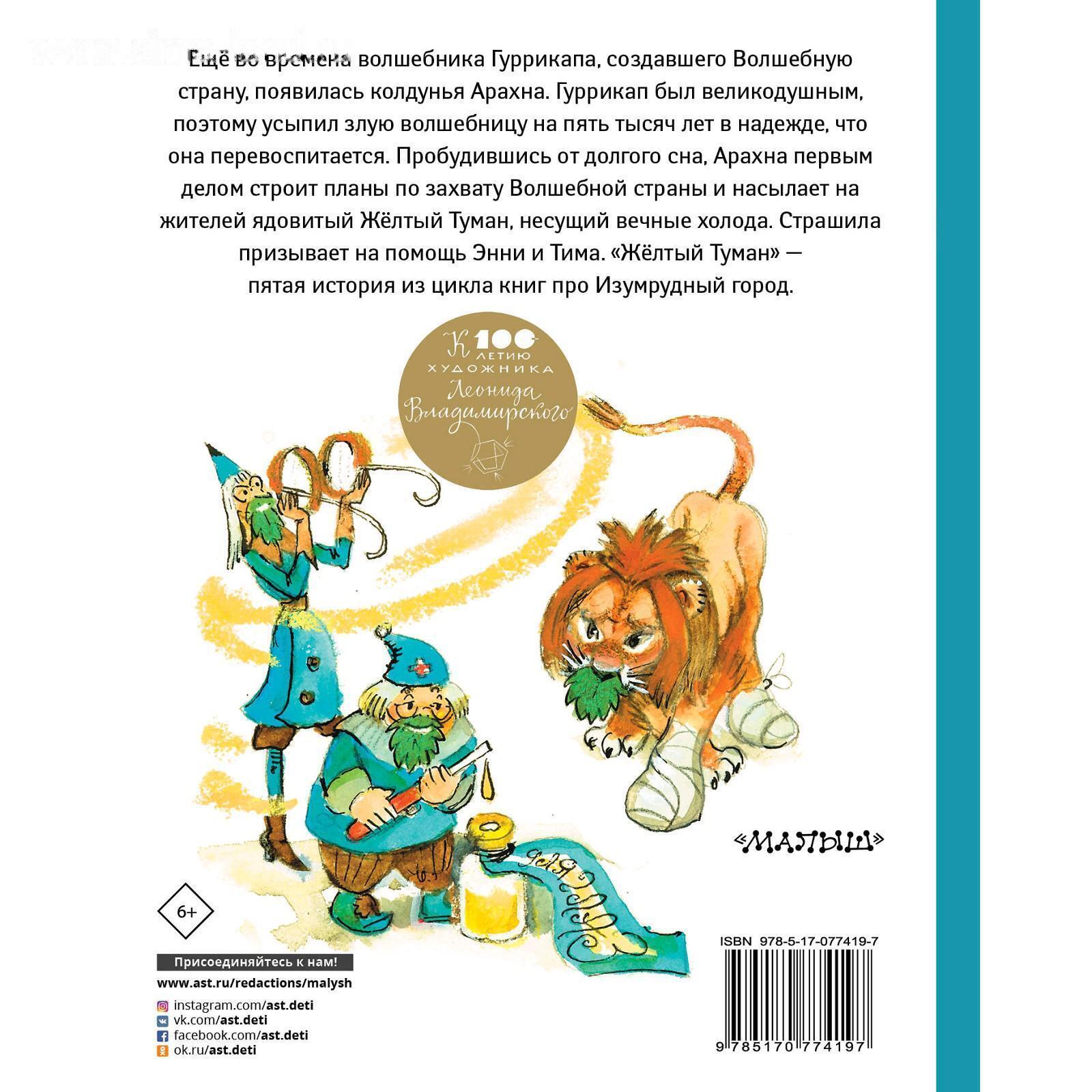Жёлтый туман - пятая сказочная повесть из цикла книг А. Волкова про Изумрудный город. Колдунья Арахна пробуждается от долгого сна и сразу замышляет захватить всю Волшебную страну. Только злые и грозные великаны, такие, как она, имеют право властвовать. Арахна забыла часть колдовских умений, но у неё всё же получается наслать на несчастных жителей отравляющий ледяной жёлтый туман. На помощь спешат Энни, Тим и Чарли Блек. Художнику книги Леониду Владимирскому в 2020 году исполняется 100 лет. Автор книги Александр Волков считал его иллюстрации лучшими.