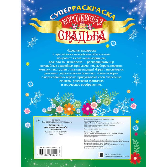 Чудесная раскраска с красочными наклейками обязательно понравится маленьким модницам, ведь это так интересно — раскрашивать мир волшебных свадебных приключений, выбирать невесте, жениху и их гостям стильные наряды! Играя с наклейками, девочки с удовольствием сочиняют новые истории о нарисованных героях, придумывают свои свадебные сюжеты, развивают фантазию и творческое воображение.