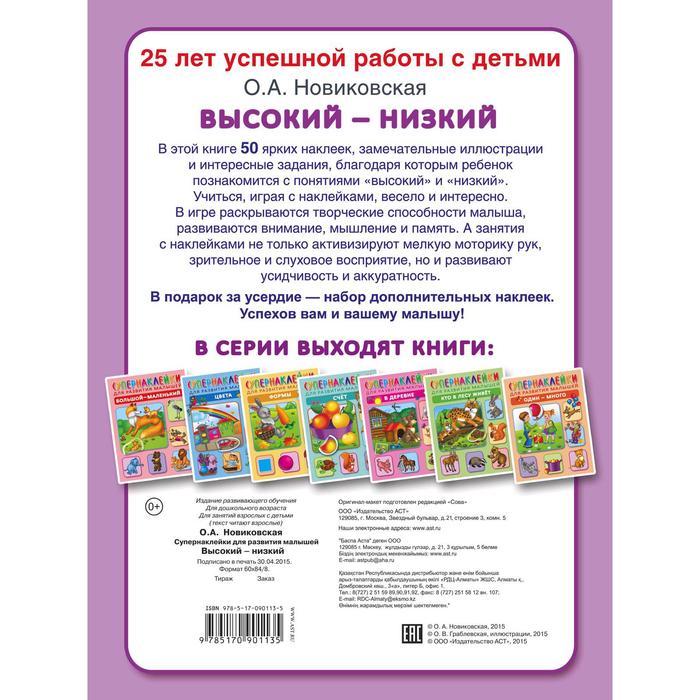<p>Уникальная методика от логопеда-практика О. А. Новиковской с 25-летним стажем успешной работы с детьми. Ребенок познакомится с понятиями «высокий» и «низкий». В книге замечательные иллюстрации, интересные задания и 50 ярких наклеек. Учиться, играя с наклейками, весело и интересно. В игре раскрываются творческие способности малыша, развиваются внимание, мышление и память. А занятия с наклейками не только активизируют тактильное, зрительное и слуховое восприятие, но и развивают усидчивость и аккуратность. </p>