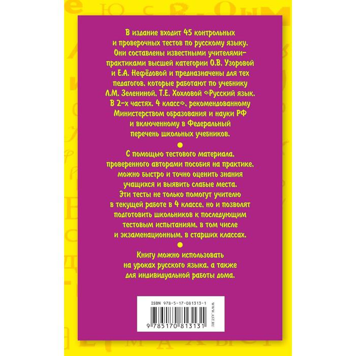<p>В издание входит 45 контрольных и проверочных тестов по русскому языку. Они составлены известными учителями-практиками высшей категории О. В. Узоровой и Е. А. Нефёдовой и предназначены для тех педагогов, которые работают по учебнику Л. М. Зелениной, Т. Е. Хохловой «Русский язык. В 2-х частях. 4 класс», рекомендованному Министерством образования и науки РФ и включенному в Федеральный перечень школьных учебников. Эти тесты не только помогут учителю в текущей работе в 4 классе, но и позволят подготовить школьников к последующим тестовым испытаниям, в том числе и экзаменационным, в старших классах. Книгу можно использовать на уроках русского языка, а также для индивидуальной работы дома. </p>