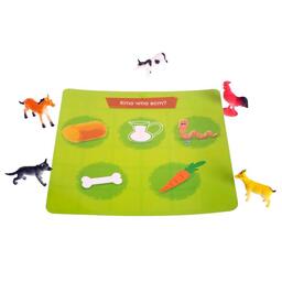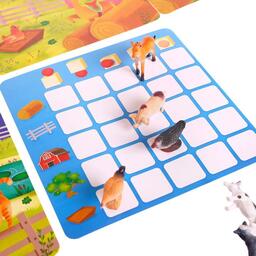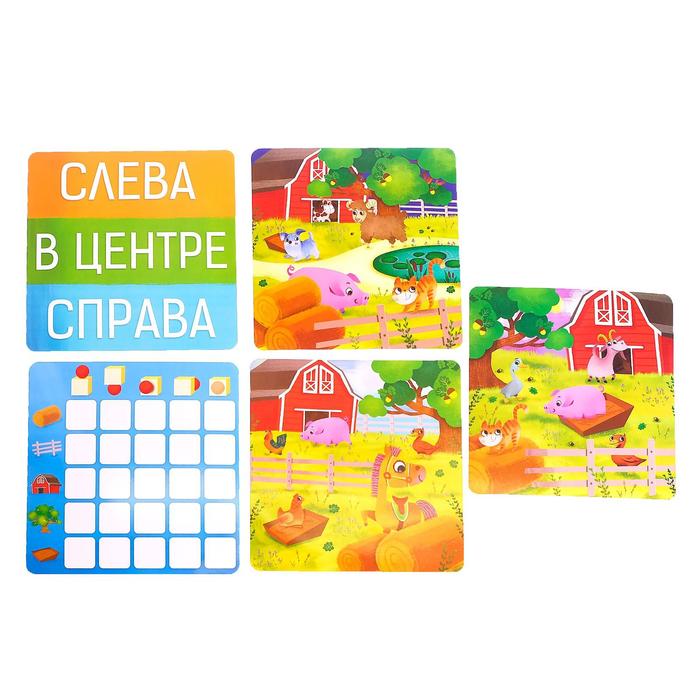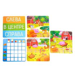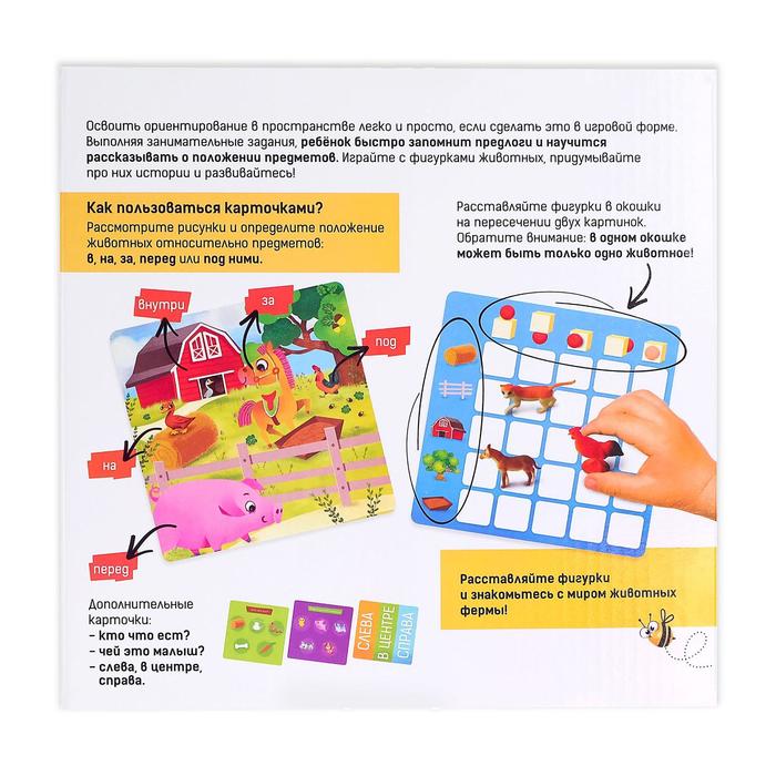 <p>Это развивающая игра для разучивания предлогов. С ней малыш научится ориентироваться в пространстве и сможет рассказать об этом.</p><p>В наборе вы найдёте игровое поле, карточки с животными и пластиковые фигурки. Показывайте малышу картинки и определяйте, где находится то или иное животное по отношению к указанным на карточке предметам — в, на, за, перед или под ними.</p><p>Например, свинюшка находится в сарае. Поставьте поросёнка на ячейку игрового поля, которая расположена на пересечении ячейки с домиком и ячейки, обозначающей предлог «внутри», — шар внутри кубика.</p><p>Расставляя животных таким образом, мы развиваем пространственное мышление малыша и учим его рассказывать о положении вещей в пространстве. А ещё из игры кроха узнает, чем питаются фермерские зверята и чьи они детёныши.</p><p><b>Играйте с животными, придумывайте про них истории и развивайтесь!</b></p>