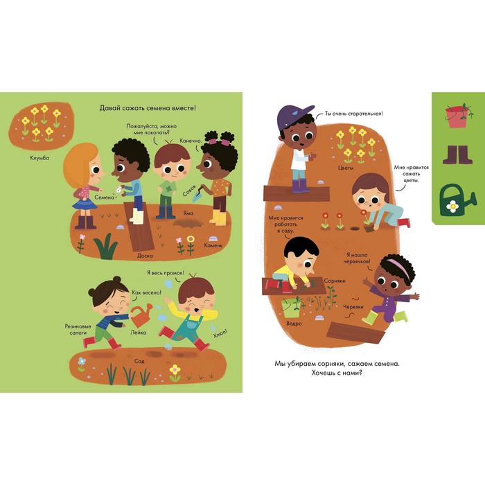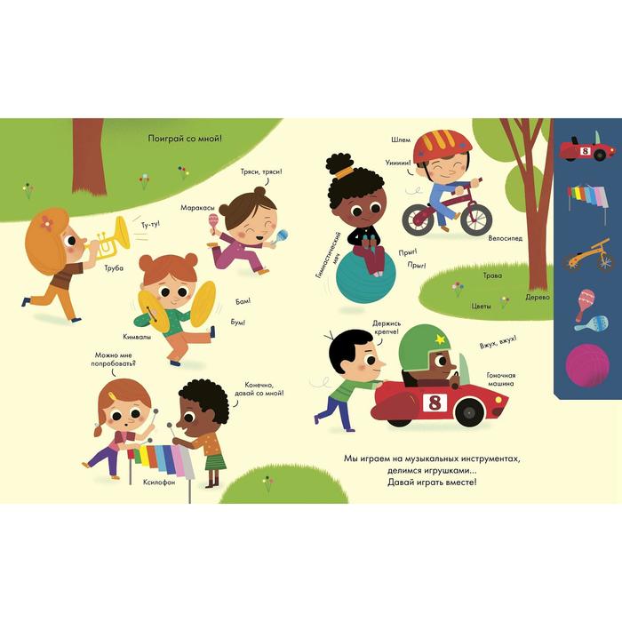 <p>Эта красочная книжка обязательно понравится юному исследователю мира. Рассматривайте иллюстрации на самые разные темы приготовление пирожных , строительство домика, посадка цветов , кормление животных, игра на музыкальных инструментах, поход к ветеринару и уборка комнаты. Учите новые слова, сочиняйте истории, обсуждайте с малышом ситуации на картинках. А еще вы найдете любимую игру «найди и покажи»!</p>