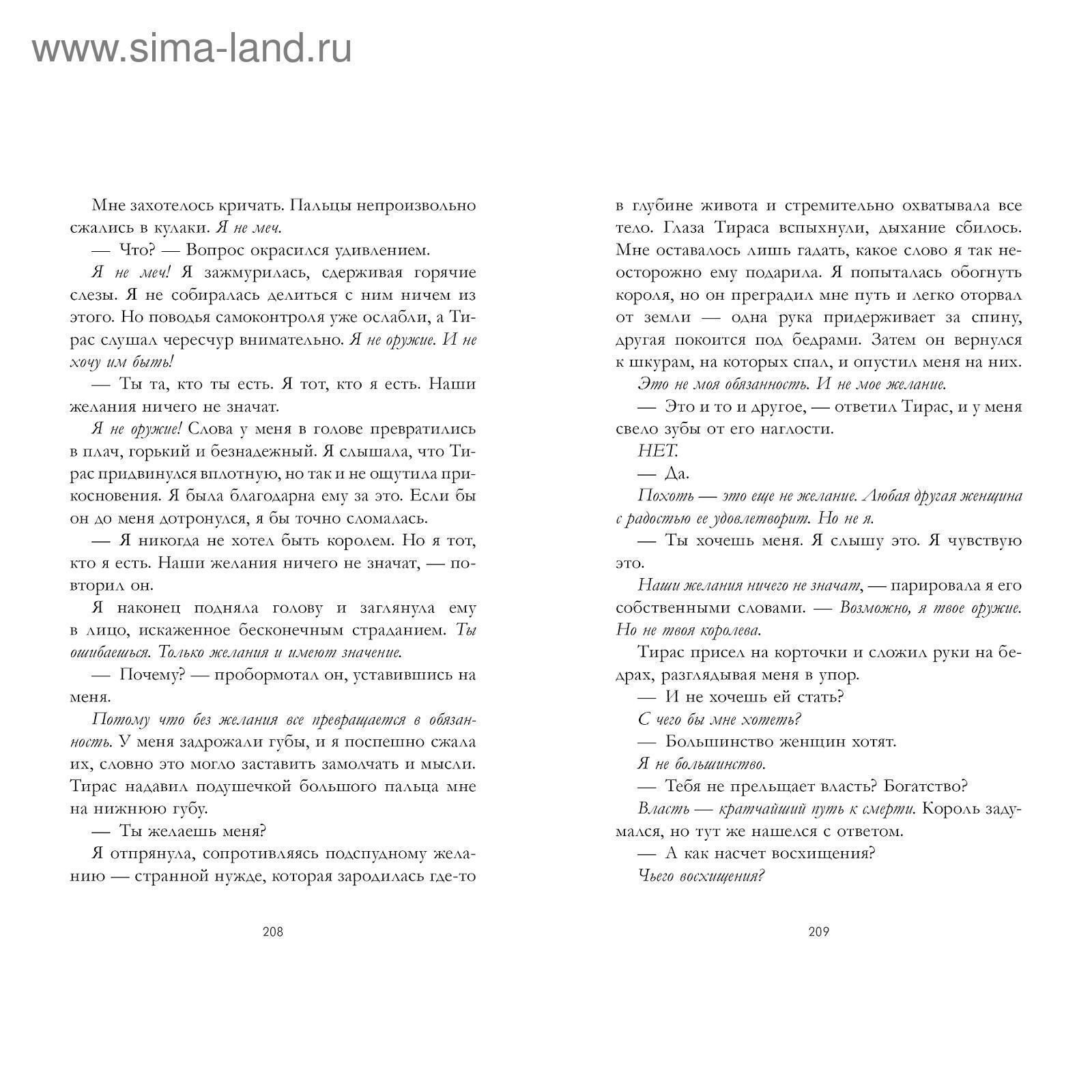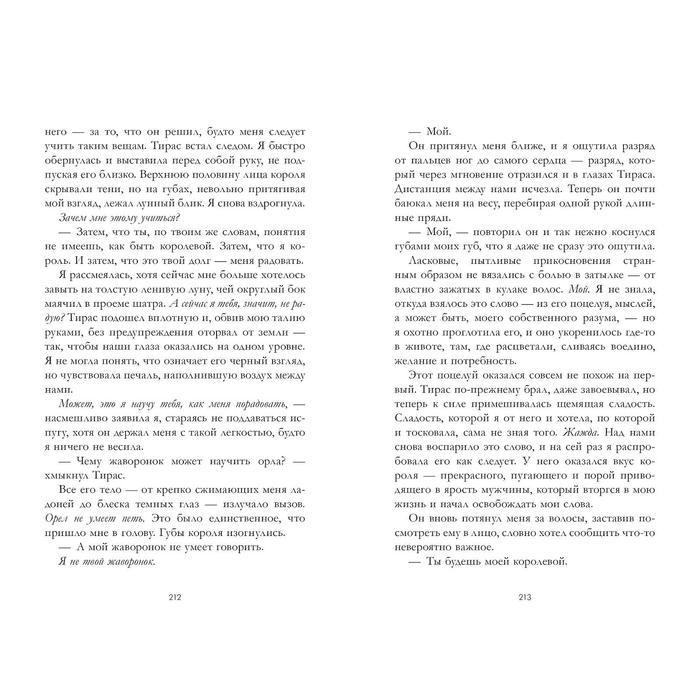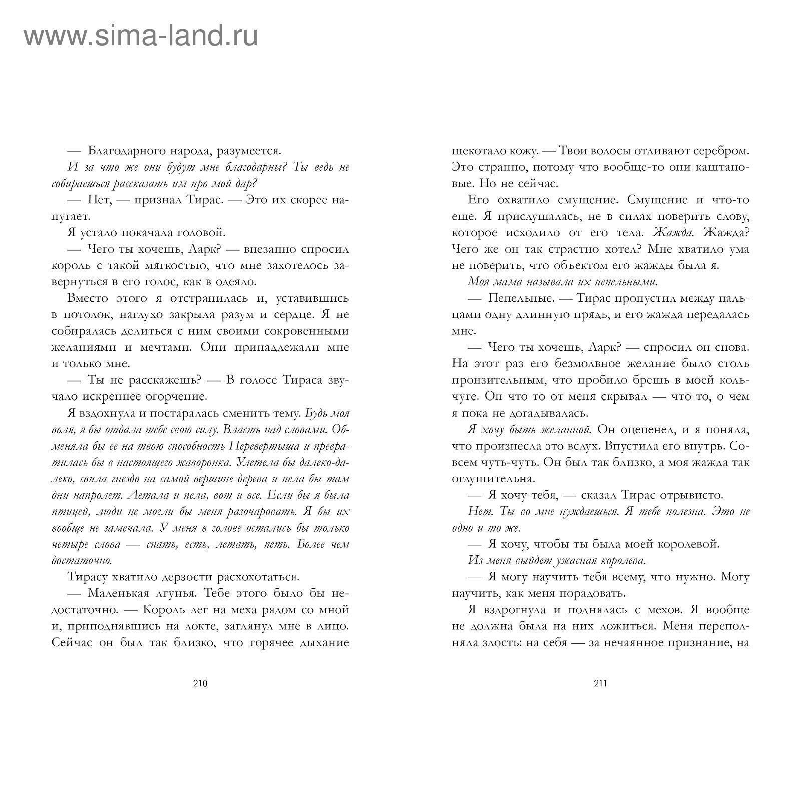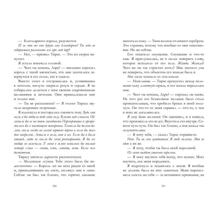 Однажды жестокий король Золтев убил мою мать из-за ее волшебного дара. Чтобы скрыть и мой дар, она приказала мне навек замолчать. Прошло много лет, и молодой король Тирас, сын Золтева, захватил меня в плен. Все, о чем я мечтаю, - стать свободной, вновь обрести голос. Но для этого нужно убежать. А я - пленница маминого проклятия, молодого короля и… любви к нему. Он не похож на злого отца. Каждую ночь Тирас борется с чудовищем внутри себя. И каждую ночь, проигрывая битву, исчезает на несколько дней. В королевстве, где веками истреблялась магия, единственная сила, способная даровать свободу нам обоим, - любовь. Но слышит ли король мои слова?