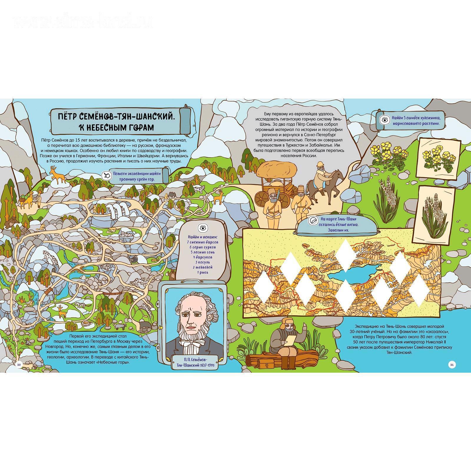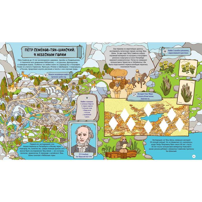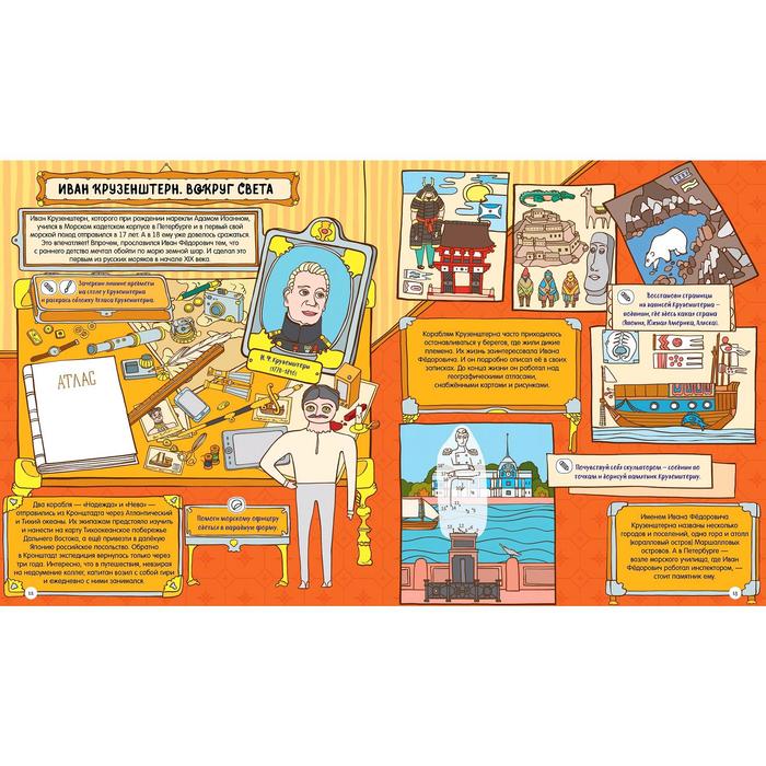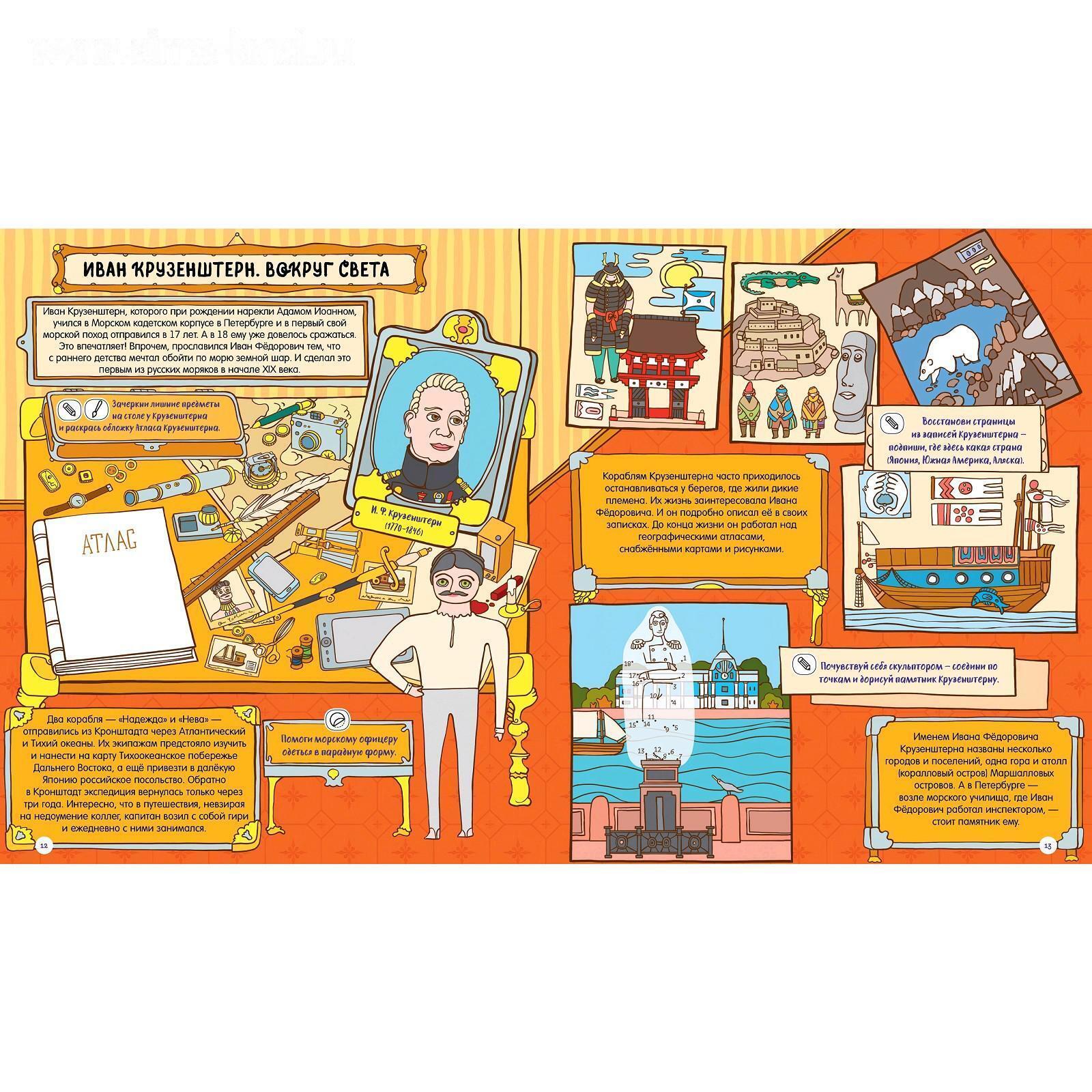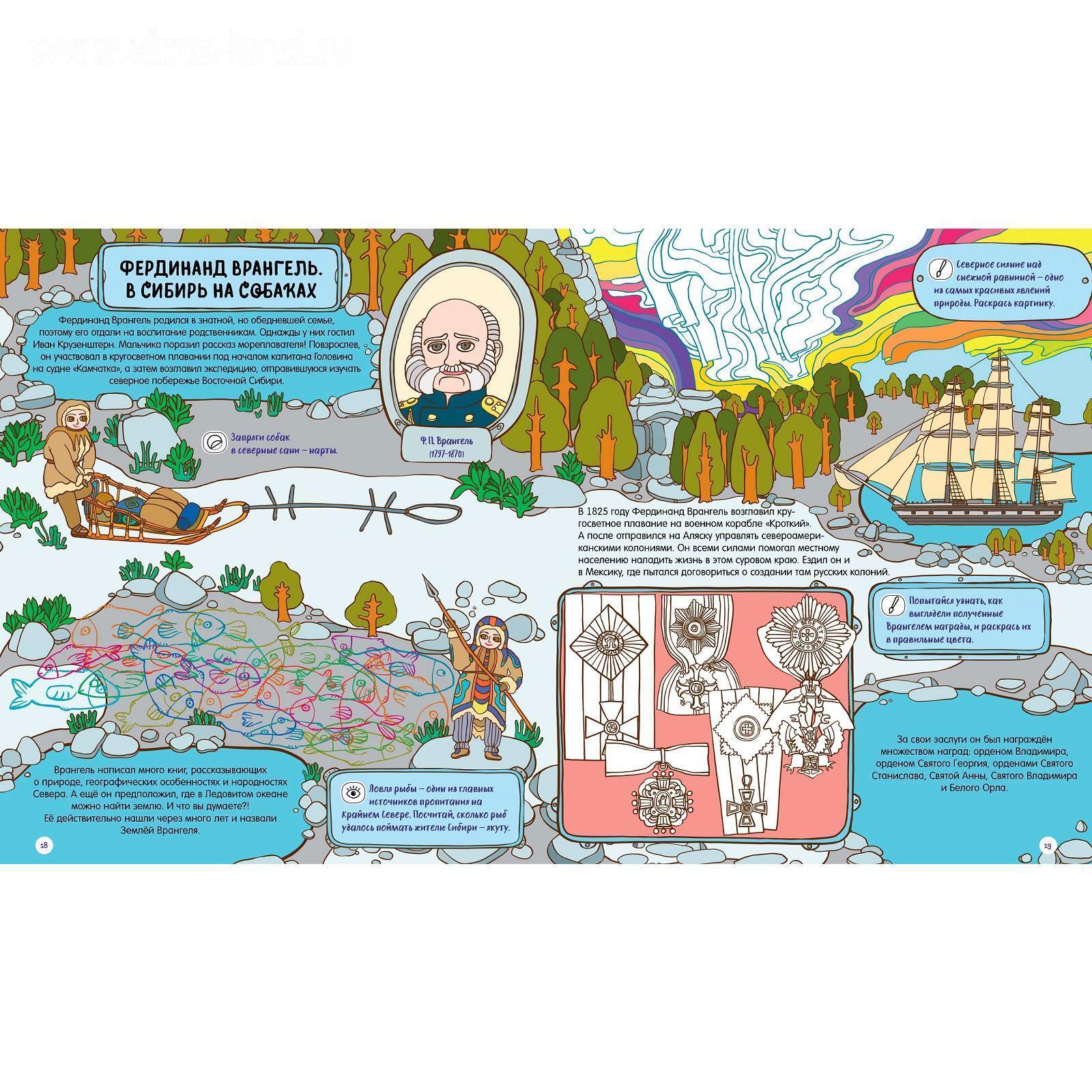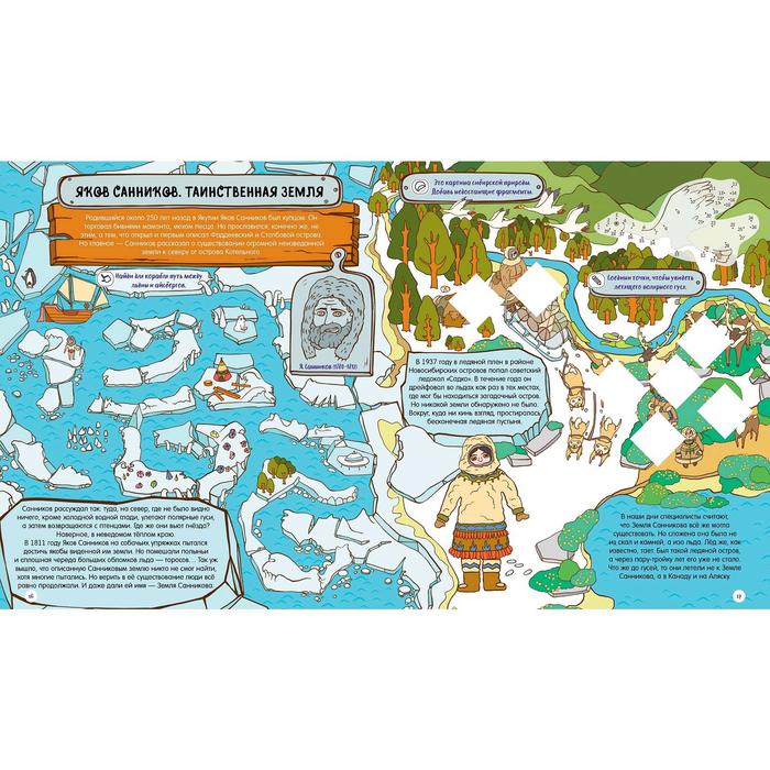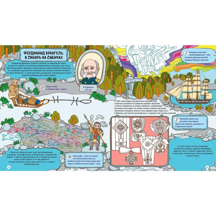 Изучайте историю русских путешественников и первооткрывателей в форме веселой игры. Множество заданий на каждом развороте! Помогите Семену Дежневу построить корабль, чтобы он смог исследовать Северный Ледовитый океан. Узнайте, куда улетают полярные гуси и существует ли Земля Санникова. Отправляйтесь в опасное путешествие с Иваном Крузенштерном, чтобы открыть Антарктиду и обогнуть земной шар!