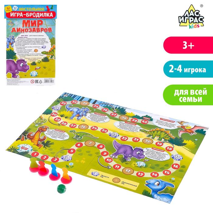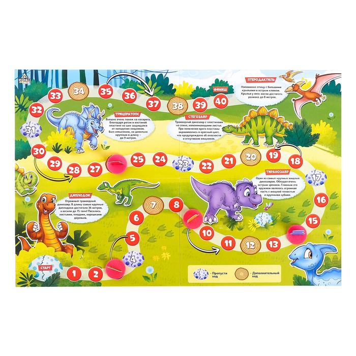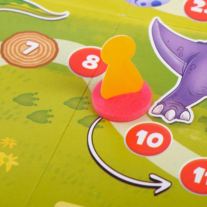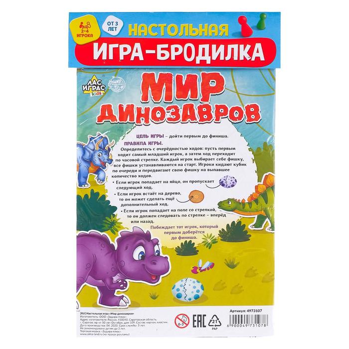 <p>Отправляйтесь в увлекательное путешествие по парку Юрского периода и знакомьтесь с динозаврами. Они помогут вам выполнить все задания, пройти испытания и первым прийти к финишу!</p><p>Яркое поле с заданиями привлекает внимание малыша. Расскажите ему об этих созданиях, как они называются, где обитают и чем питаются. Игра развивает кругозор малыша, память, мышление.</p><p><b>Правила игры</b></p><ol><li>Каждый игрок выбирает себе фишку и устанавливает её на старт.</li><li>Кидайте кубик по очереди и передвигайте фишку на выпавшее количество ходов.</li><li>Выполняйте задания, указанные на игровом поле.</li><li>Побеждает тот, кто пройдёт все испытания и первым доберётся до финиша!</li></ol><p>Игра-бродилка рекомендована детям старше 3 лет и рассчитана на 2–4 участников любого возраста!</p><p><b>Весёлой вам игры!</b></p>
