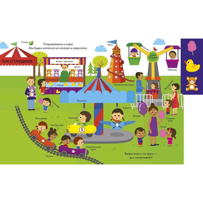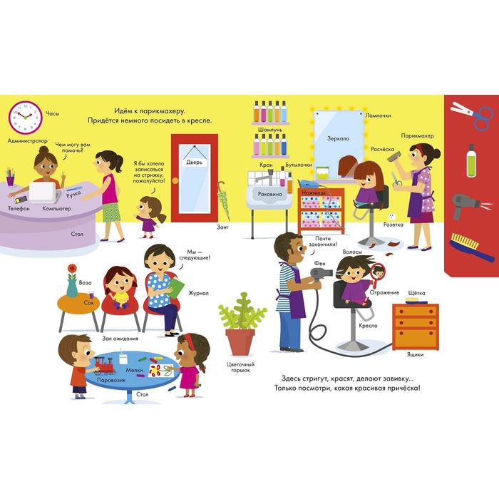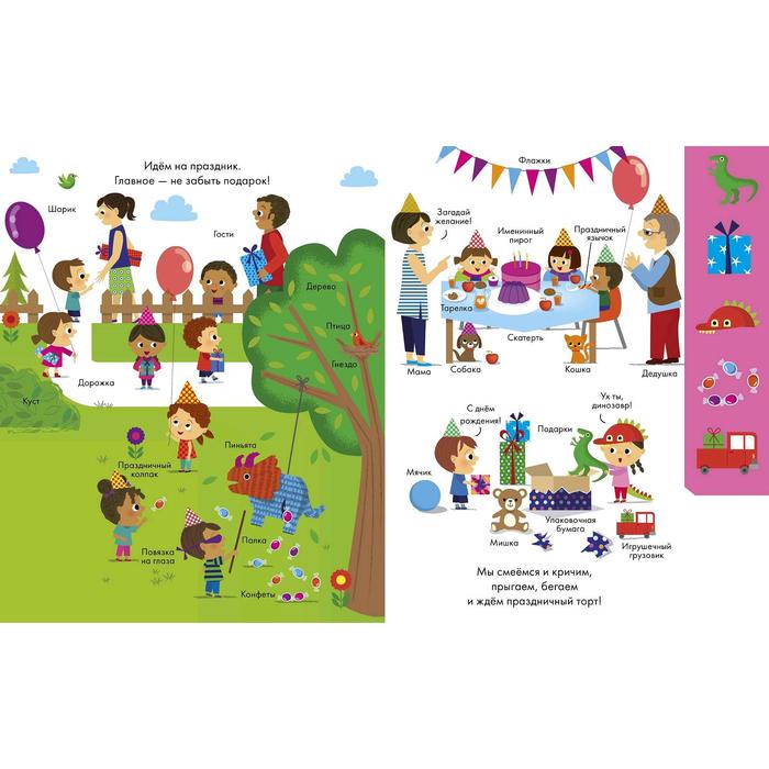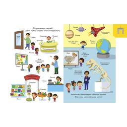 <p>Эта красочная книжка обязательно понравится юному исследователю мира. Рассматривайте иллюстрации на самые разные темы поход в музей, в кино, в театр, на детскую площадку, в библиотеку, к парикмахеру, на ферму или на праздник Учите новые слова, сочиняйте истории, обсуждайте с малышом ситуации на картинках. А еще вы найдете любимую игру «найди и покажи»!</p>