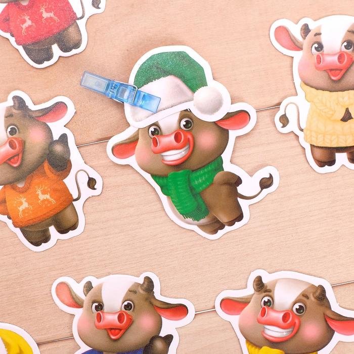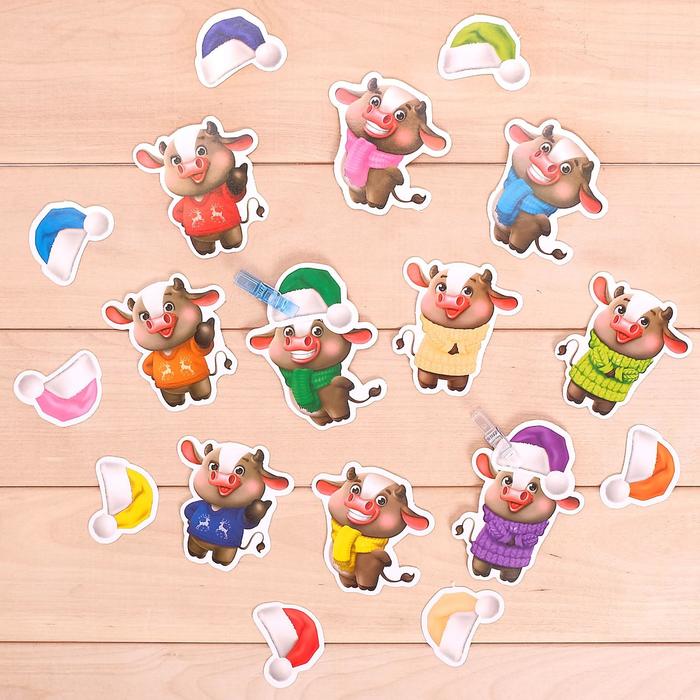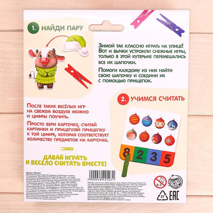 <p>Подарите малышу праздничное настроение, устроив настоящие снежные игры с бычками! Развивающий набор «IQ-прищепки. Новогодние забавы» — это множество красочных тематических картинок, 10 волшебных прищепок и карточки с заданиями.</p><p>Бычки растеряли свои шапочки в снегу. Спасите их от холода! Попросите кроху найти шапочку каждому бычку в цвет его одёжки.</p><p>А теперь давайте все вместе посчитаем новогодние игрушки. Рассмотрите картинки на карточке, посчитайте их и прикрепите прищепку к той цифре, которая соответствует количеству предметов.</p><p>Создайте новогоднее настроение дома! Украсьте вместе с малышом детскую комнату волшебными картинками. И пусть символ года принесёт вам много радости и счастья!</p>