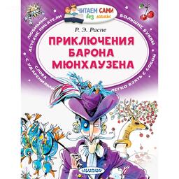 Книга «Приключения барона Мюнхаузена» прекрасно подходит для первого самостоятельного чтения, ведь в ней большие буквы, слова с ударениями и цветные иллюстрации.