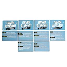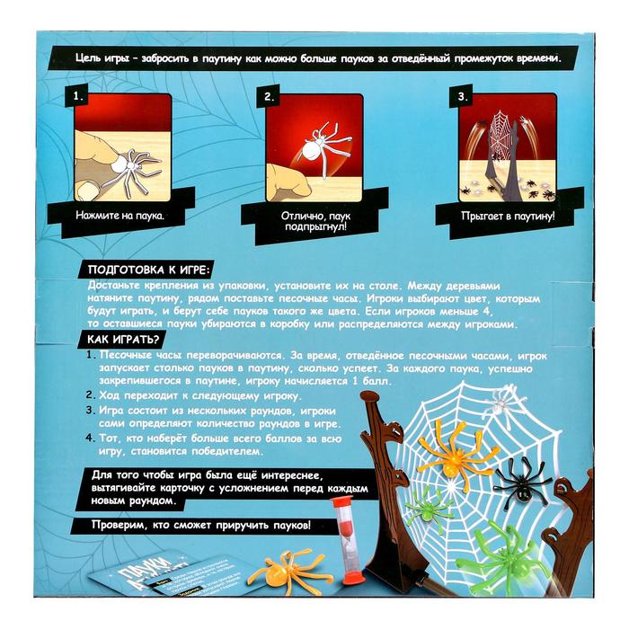 <p>Настольная игра «Пауки атакуют» отлично развивает ловкость и меткость! Рекомендована детям старше 5 лет и рассчитана на 2–4 участников.</p><p>Игра состоит из нескольких раундов. Их количество определяют участники.</p><p>Игроки по очереди на время запускают паучков в паутину. За каждого прикрепившегося к паутине насекомого участник получает по 1 баллу.</p><p>Самый ловкий участник, набравший наибольшее количество баллов за всю игру, побеждает!</p><p>Сделайте игру ещё интереснее: берите карточки с развлекательными заданиями и выполняйте их перед каждым новым раундом.</p><p><b>Давайте проверим, кто сможет приручить опасных паучков!</b></p>