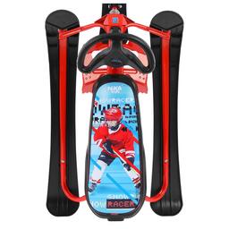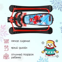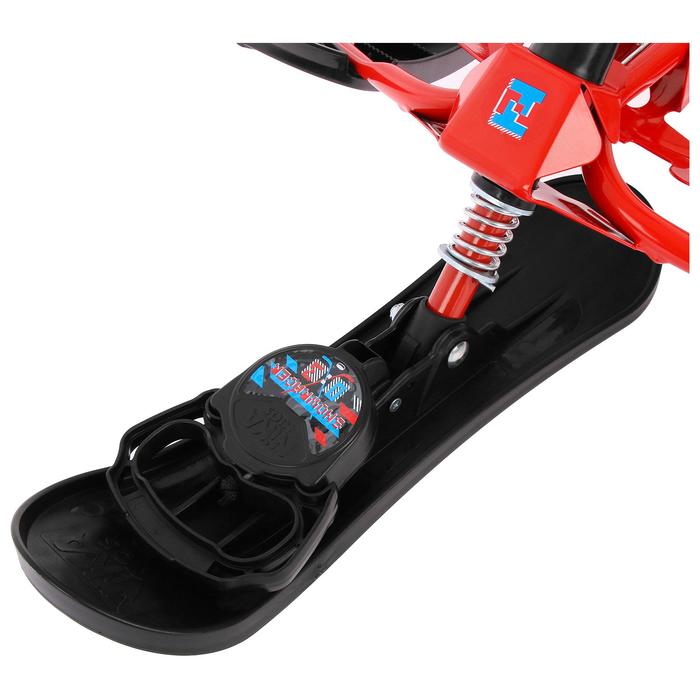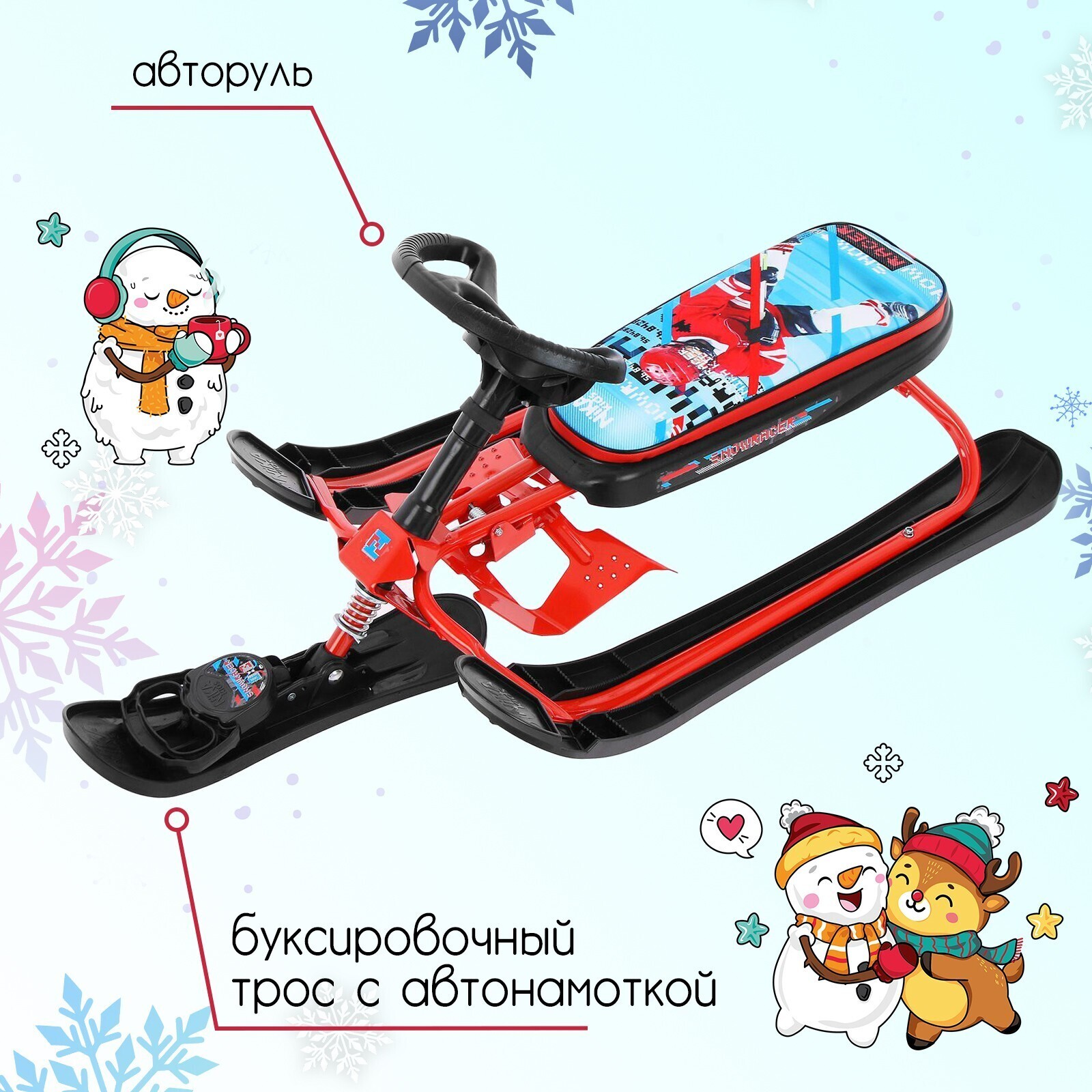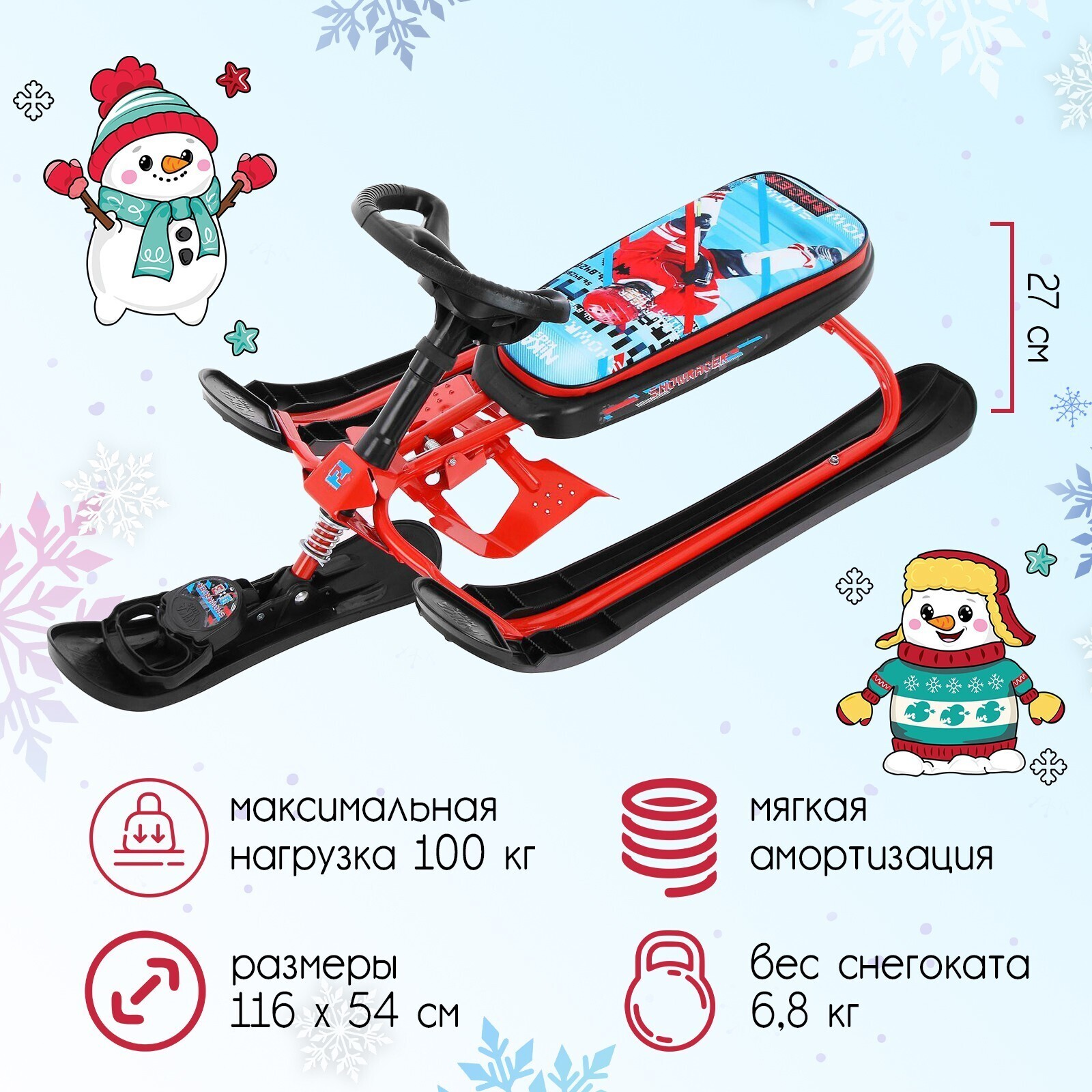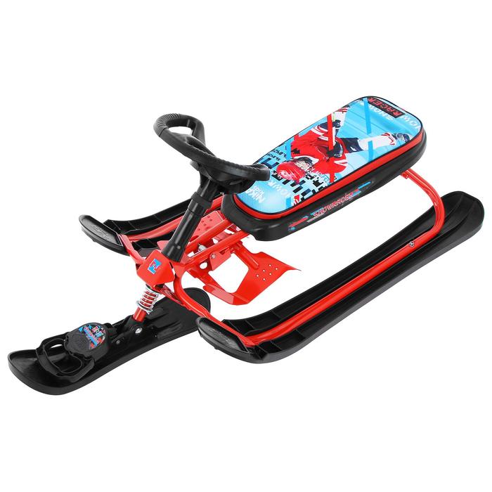 Снегокат предназначен для перевозки детей по плотному снегу или льду, катанию с горок. Имеет сварную конструкцию из стальных труб, пластиковых элементов и мягкое сиденье, обтянутое искусственной кожей с рисунком. Оснащён буксировочным тросом с автоматической намоткой и системой амортизации, которая обеспечивает комфортную поездку по крутым горкам и неровным поверхностям. Усиленный тормоз эффективен на обледенелой поверхности.