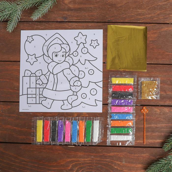Процесс создания картины из песка прост и увлекателен. Снимите верхний слой с одного сектора картинки и засыпьте его песком, блёстками или заполните фольгой, помогайте стекой. Можете ориентироваться на цифры в секторах и подсказку на упаковке или пофантазировать и создать свою уникальную картину!