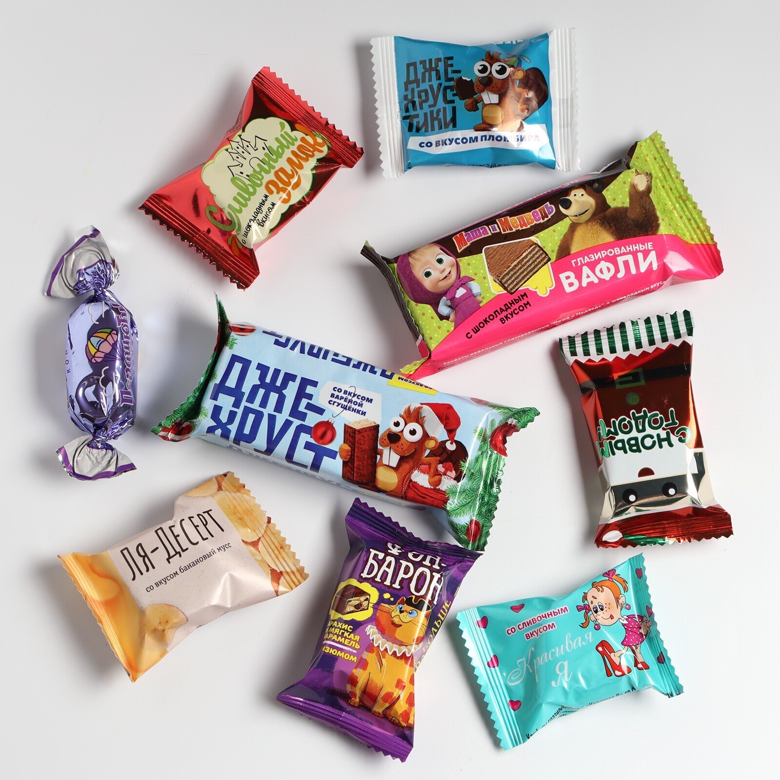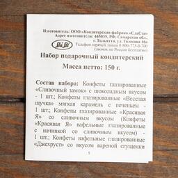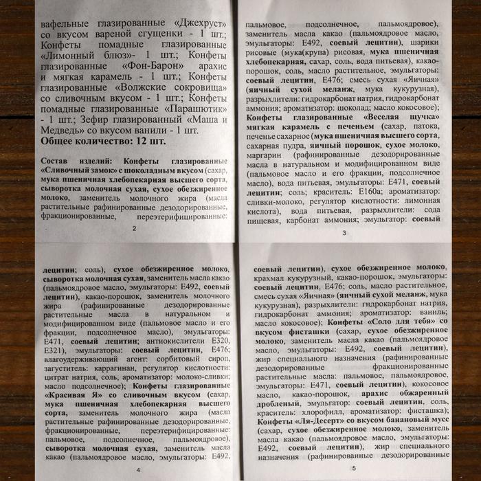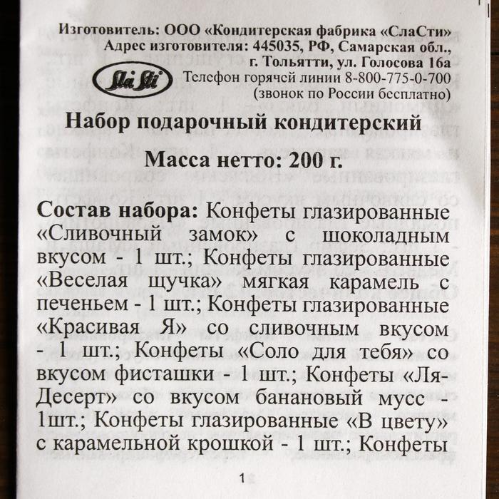 <h4>В набор входит 12 конфет КФ «Сласти»:</h4><ul><li>конфета «Сливочный замок» с шоколадным вкусом - 1 шт.</li><li>конфета «Весёлая щучка» (мягкая карамель с печеньем) - 1 шт.</li><li>конфета глазированная «Красивая Я» со сливочным вкусом - 1 шт.</li><li>конфета вафельная глазированная «Джехруст» со вкусом варёной сгущёнки - 1 шт.</li><li>конфета «Соло для тебя» со вкусом фисташки - 1 шт.</li><li>конфета «Ля-Десерт» со вкусом банановый мусс - 1 шт.</li><li>конфета глазированная «Волжские сокровища» со сливочным вкусом - 1 шт.</li><li>конфета «В цвету» с карамельной крошкой - 1 шт.</li><li>конфета помадная глазированная «Лимонный блюз» - 1 шт.</li><li>конфета помадная глазированная «Парашютик» - 1 шт.</li><li>зефир глазированный «Маша и Медведь» со вкусом ванили - 1 шт.</li><li>конфета глазированная «Фон-барон» (арахис и мягкая карамель) - 1 шт.</li></ul><p>Изготовитель оставляет за собой право частичной замены товара на аналогичный.</p>