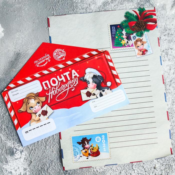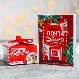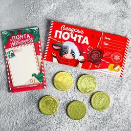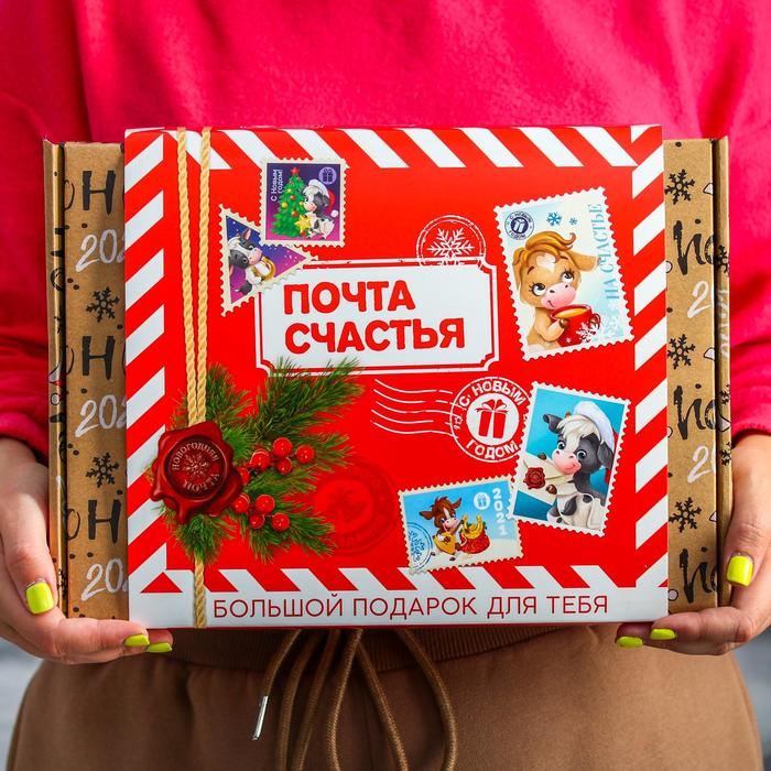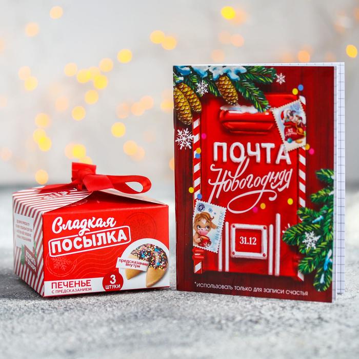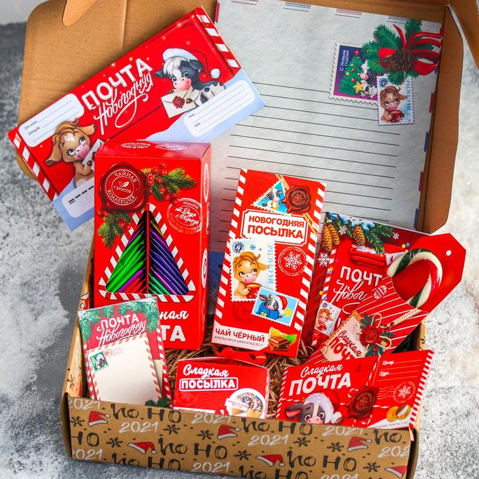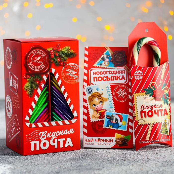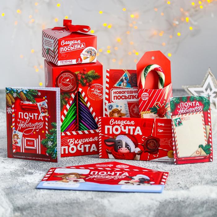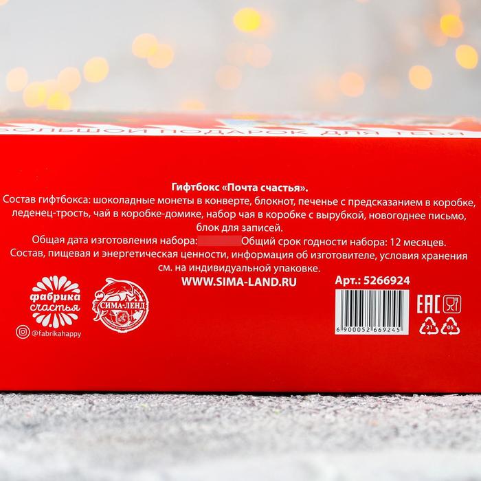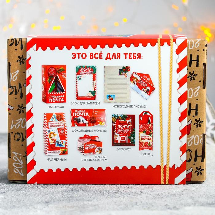 Гифтбокс подарочный «Почта счастья»: чай ассорти вкусов 35 п , блок для записей, новогодние письмо, чай чёрный с ароматом апельсина и шоколада 50 г, шоколадные монет 5 шт. х 6 г, печенье с предсказанием 3 шт., блокнот, леденец 30 г 5266924
