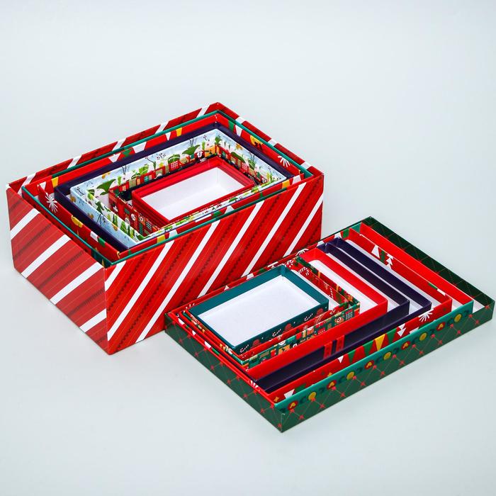 <p><b>В наборе 10 коробок:</b></p><ul><li>12 × 7 × 4 см;</li><li>14 × 8,4 × 4,5 см;</li><li>15 × 9,5 × 5,5 см;</li><li>18 × 11 × 6,5 см;</li><li>20 × 12,5 × 7,5 см;</li><li>22 × 14 × 8,5 см;</li><li>24 × 15,5 × 9,5 см;</li><li>26 × 17 × 10,5 см;</li><li>28 × 18,5 × 11,5 см;</li><li>32,5 × 20 × 12,5 см.</li></ul>