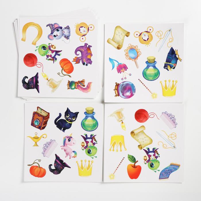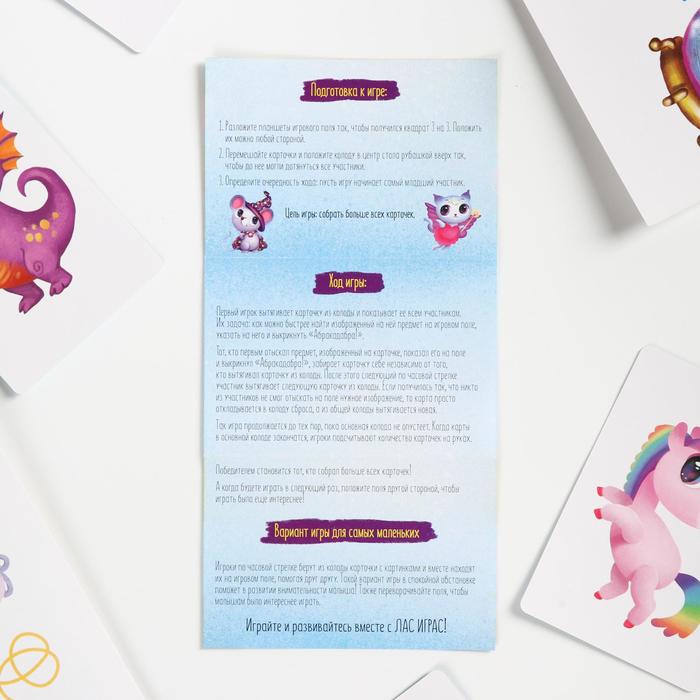 <p><b>Настольная игра на скорость и внимание</b></p><p>В этой игре юным магам предстоит вытягивать карточки и быстрее всех искать на поле волшебные предметы. Только не забывайте каждый раз кричать «абракадабра!», а то карточку может забрать другой волшебник. Будьте внимательнее всех!</p><p><b>Что нужно делать?</b></p><p>Для начала разложите планшеты игрового поля так, чтобы получился квадрат 3 на 3. Положить их можно любой стороной. Перемешайте карточки и положите колоду в центр стола рубашкой вверх.</p><p>Цель игры — набрать как можно больше карточек. А как это сделать? Один из игроков открывает верхнюю карту в колоде. Теперь задача всех участников: как можно быстрее найти изображённый на ней предмет на игровом поле, указать на него и выкрикнуть «абракадабра!».</p><p>Тот, кто первым отыскал предмет, изображённый на карточке, забирает карточку себе. Далее в колоде открывается новая карта, и игра продолжается дальше. Так продолжается до тех пор, пока основная колода не опустеет. Когда карты в ней закончатся, игроки подсчитывают количество карточек на руках. Победителем становится тот, кто собрал их больше всех!</p><p><b>Внутри вы найдёте</b></p><ul><li>45 карточек.</li><li>9 планшетов игрового поля.</li><li>Правила игры.</li></ul><p><b>Смотрите, ищите, побеждайте!</b></p>