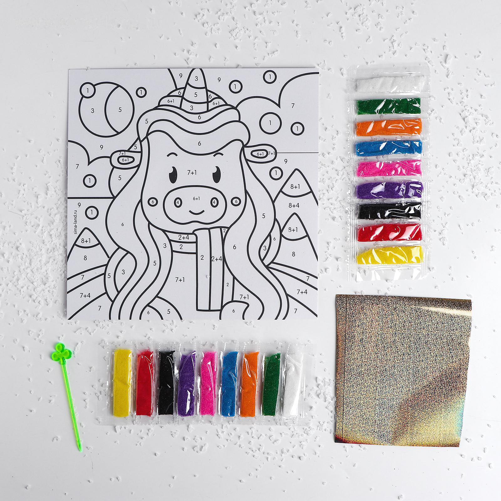 Процесс создания картины из песка прост и увлекателен. Снимите верхний слой с одного сектора картинки и засыпьте его песком, блёстками или заполните фольгой, помогайте стекой. Можете ориентироваться на цифры в секторах и подсказку на упаковке или пофантазировать и создать свою уникальную картину!