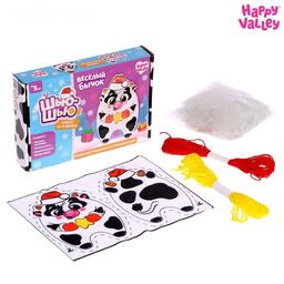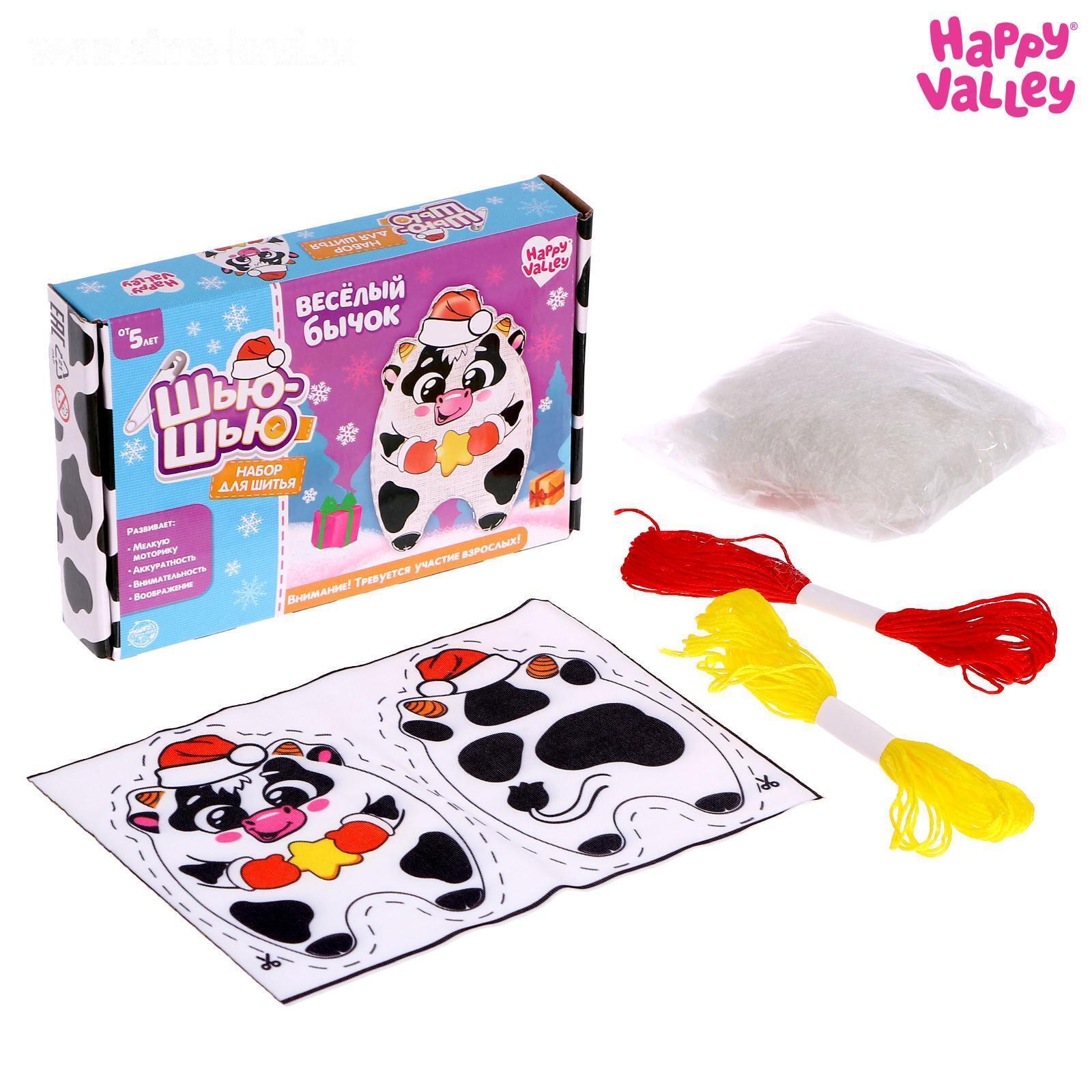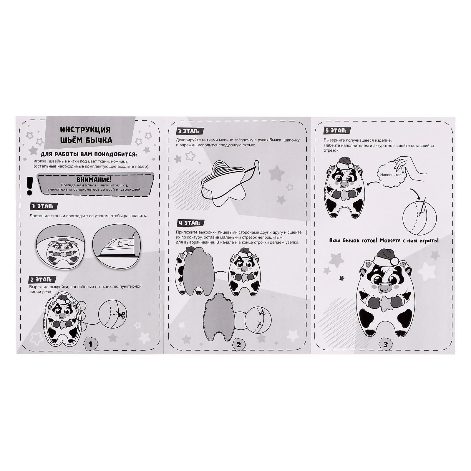 Следуйте инструкции! Вырежьте детали изделия и декорируйте его нитками мулине. Сложите ткань лицевыми сторонами, сшейте по контуру и выверните. Затем набейте наполнителем. Правила пользования подробно описаны в инструкции, внимательно прочитайте её. Также в книжке представлены картинки бычка на каждом этапе шитья.