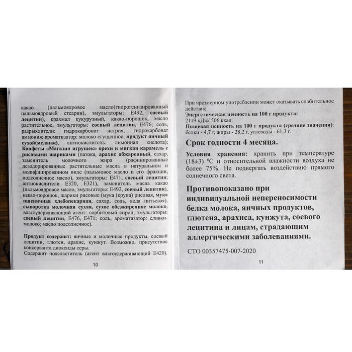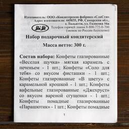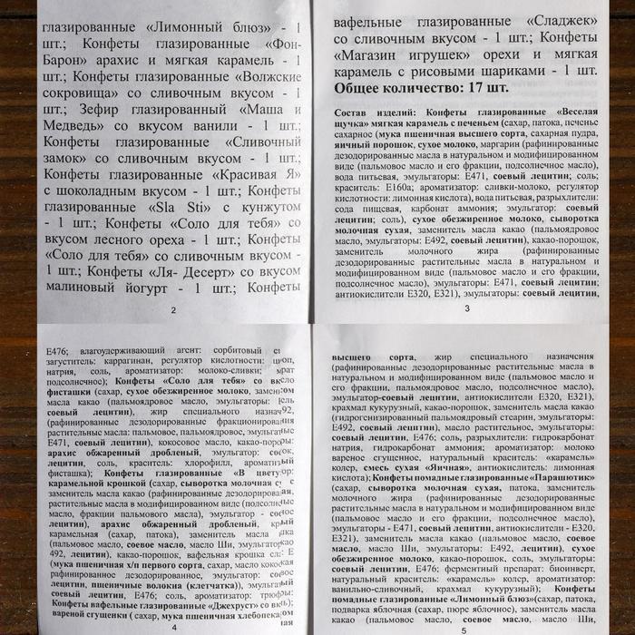 <h4>В набор входит 17 конфет КФ «Сласти»:</h4><ul><li>конфета «Весёлая щучка» (мягкая карамель с печеньем) - 1 шт.</li><li>конфета «Соло для тебя» со вкусом фисташки - 1 шт.</li><li>конфета «В цвету» с карамельной крошкой - 1 шт.</li><li>конфета вафельная глазированная «Джехруст» со вкусом вареной сгущенки - 1 шт.</li><li>конфета помадная глазированная «Парашютик» - 1 шт.</li><li>конфета помадная глазированная «Лимонный блюз» - 1 шт.</li><li>конфета глазированная «Фон-барон» (арахис и мягкая карамель) - 1 шт.</li><li>конфета глазированная «Волжские сокровища» со сливочным вкусом - 1 шт.</li><li>зефир глазированный «Маша и Медведь» со вкусом ванили - 1 шт.</li><li>конфета «Сливочный замок» со сливочным вкусом -1 шт.</li><li>конфета глазированная «Красивая Я» с шоколадным вкусом - 1 шт.</li><li>конфета Sla Sti с кунжутом - 1шт.</li><li>конфета «Соло для тебя» со сливочным вкусом - 1 шт.</li><li>конфета «Соло для тебя» со вкусом лесного ореха - 1 шт.</li><li>конфета «Ля- Десерт» со вкусом малиновый йогурт - 1 шт.</li><li> конфета вафельная глазированная «Сладжек» со сливочным вкусом - 1 шт.</li><li>конфета «Магазин игрушек» (орехи, мягкая карамель и рисовые шарики) - 1 шт.</li></ul><p>Изготовитель оставляет за собой право частичной замены товара на аналогичный.</p>