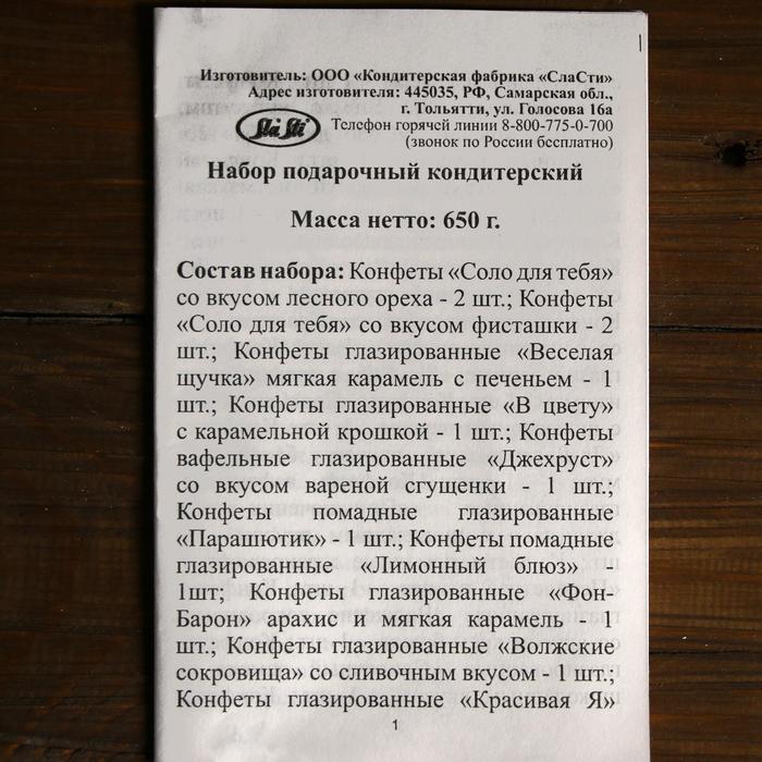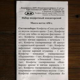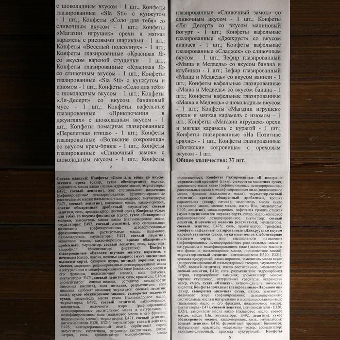 <h4>В набор входит 37 конфет КФ «Сласти»:</h4><ul><li>конфета «Сливочный замок» с шоколадным вкусом -1 шт.</li><li>конфета «Сливочный замок» со сливочным вкусом -1 шт.</li><li>конфета глазированная «Красивая Я» со вкусом врёной сгущенки - 1 шт.</li><li>конфета глазированная «Красивая Я» со сливочным вкусом - 1 шт.</li><li>конфета «Весёлая щучка» (мягкая карамель с печеньем) - 1 шт.</li><li>конфета «Весёлый подсолнух» - 1 шт.</li><li>конфета вафельная глазированная «Приключения в джунглях» с шоколадным вкусом - 1 шт.</li><li>конфета Sla Sti с кунжутом - 1шт.</li><li>конфета Sla Sti с кунжутом и изюмом - 1 шт.</li><li>конфета «Соло для тебя» со вкусом лесного ореха - 2 шт.</li><li>конфета «Соло для тебя» со сливочным вкусом - 1 шт.</li><li>конфета «Соло для тебя» со вкусом фисташки - 2 шт.</li><li>конфета «Ля- Десерт» со вкусом банановый мусс - 1 шт.</li><li>конфета «Ля- Десерт» со вкусом малиновый йогурт - 1 шт.</li><li>конфета «Соло для тебя» с шоколадным вкусом - 1 шт.</li><li>конфета вафельная глазированная «Джехруст» со вкусом вареной сгущенки - 1 шт.</li><li>конфета помадная глазированная «Лимонный блюз» - 1 шт.</li><li>конфета «В цвету» с карамельной крошкой - 1 шт.</li><li>конфета помадная глазированная «Перелетная птица» - 1 шт.</li><li>конфета глазированная «Волжские сокровища» со вкусом крем-брюле - 1 шт.</li><li>конфета вафельная глазированная «Джехруст» со вкусом ананаса - 1 шт.</li><li>конфета помадная глазированная «Парашютик» - 1 шт.</li><li> конфета вафельная глазированная «Сладжек» со сливочным вкусом - 1 шт.</li><li>конфета глазированная «На Позитиве арахис» - 1 шт.</li><li>конфета «Магазин игрушек» (орехи, мягкая карамель и рисовые шарики) - 1 шт.</li><li>конфета «Магазин игрушек» (орехи, мягкая карамель с изюмом) - 1 шт.</li><li>конфета «Магазин игрушек» (орехи, мягкая карамель с курагой) - 1 шт.</li><li>конфета глазированная «Фон-барон» (арахис и мягкая карамель) - 1 шт.</li><li>конфета глазированная «Волжские сокровища» со сливочным вкусом - 1 шт.</li><li>конфета глазированная «Красивая Я» с шоколадным вкусом - 1 шт.</li><li>зефир глазированный «Маша и Медведь» со вкусом банана и клубники - 1 шт.</li><li>конфета глазированная «Волжские сокровища» с ореховым вкусом - 1 шт.</li><li>зефир глазированный «Маша и Медведь» со вкусом ванили - 1 шт.</li><li>конфета вафельная глазированная «Маша и Медведь» со вкусом банана - 1 шт.</li><li>конфета вафельная глазированная «Маша и Медведь» с шоколадным вкусом - 1 шт.</li></ul><p>Изготовитель оставляет за собой право частичной замены товара на аналогичный.</p>
