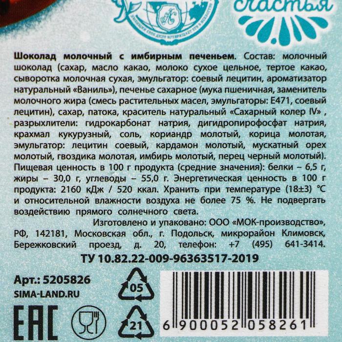 <b>Состав: молочный шоколад (сахар, масло какао, молоко сухое цельное, тертое какао, сыворотка молочная сухая, эмульгатор: соевый лецитин, ароматизатор натуральный «Ваниль»), печенье сахарное (мука пшеничная, заменитель молочного жира (смесь растительных масел, эмульгаторы: Е471, соевый лецитин), сахар, патока, краситель натуральный «Сахарный колер IV» , разрыхлители: гидрокарбонат натрия, дигидропирофосфат натрия, крахмал кукурузный, соль, кориандр молотый, корица молотая, эмульгатор: лецитин соевый, кардамон молотый, мускатный орех молотый, гвоздика молотая, имбирь молотый, перец черный молотый). Срок годности: 9 месяцев. Масса нетто: 45 г.</b>