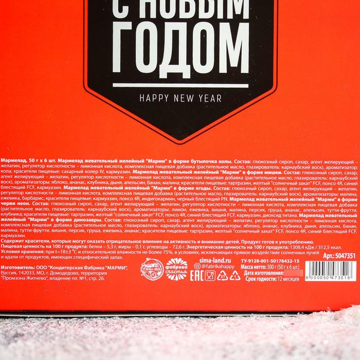 <p>Состав: Мармелад жевательный желейный «Марми» в форме бутылочки колы : глюкозный сироп, сахар, агент желирующий – желатин, регулятор кислотности – лимонная кислота (Е330), ароматизатор, красители пищевые: кармуазин (Е122), сахарный колер IV (Е150d), глазирователь: растительное масло, воск карнаубский. Мармелад жевательный желейный «Марми» в форме мишек: глюкозный сироп, сахар, агент желирующий – желатин, регулятор кислотности – лимонная кислота (Е330), ароматизаторы: «Яблоко», «Груша», «Ананас», «Клубника», «Барбарис», «Вишня», «Дыня», «Малина», «Ежевика», «Лесная ягода», «Тутти-фрутти», «Лимон», «Апельсин», «Персик», «Банан», «Черная смородина», «Земляника», «Манго», «Клюква», красители пищевые: тартразин (Е102), желтый «Солнечный закат» (Е110), понсо 4R (Е124), синий блестящий FCF (Е133), кармуазин (Е122), глазирователь – растительное масло, воск карнаубский.Мармелад жевательный желейный «Марми» в форме ягод: глюкозный сироп, сахар, агент желирующий – желатин, регулятор кислотности – лимонная кислота (Е330), ароматизаторы: «Малина», «Ежевика», «Барбарис», красители пищевые: кармуазин (Е122), понсо 4R (Е124), индигокармин (Е132), черный блестящий PN (Е151), глазирователь: растительное масло, воск карнаубский.Мармелад жевательный желейный «Марми» в форме червей неон : глюкозный сироп, сахар, агент желирующий: желатин, регулятор кислотности: лимонная кислота (Е330), ароматизаторы: «Лимон», «Ежевика», «Вишня», «Малина», «Персик», «Груша», «Ананас», «Апельсин», «Тутти-фрутти»; красители пищевые: тартразин (Е102), желтый «Солнечный закат» (Е110), понсо 4R (Е124), кармуазин (Е122), синий блестящий FCF (Е133), диоксид титана (Е171); глазирователь: растительное масло, карнаубский воск. Мармелад жевательный желейный «Марми» в форме динозавров : глюкозный сироп, сахар, агент желирующий – желатин, регулятор кислотности – лимонная кислота (Е330), ароматизаторы: «Яблоко», «Груша», «Ананас», «Клубника», «Барбарис», «Вишня», «Дыня», «Малина», «Ежевика», «Лесная ягода», «Тутти-фрутти», «Лимон», «Апельсин», «Персик», «Банан», «Черная смородина», «Земляника», «Манго», «Клюква», красители пищевые: тартразин (Е102), желтый «Солнечный закат» (Е110), понсо 4R (Е124), синий блестящий FCF (Е133), кармуазин (Е122), глазирователь – растительное масло, воск карнаубский.Масса нетто: 300 г (50 г х 6 шт.).Срок годности: 12 мес.Хранить при t +18 (±3) °С и относительной влажности не более 75 % в условиях, исключающих прямое воздействие солнечных лучей, и вдали от продуктов, имеющих специфический запах.</p>