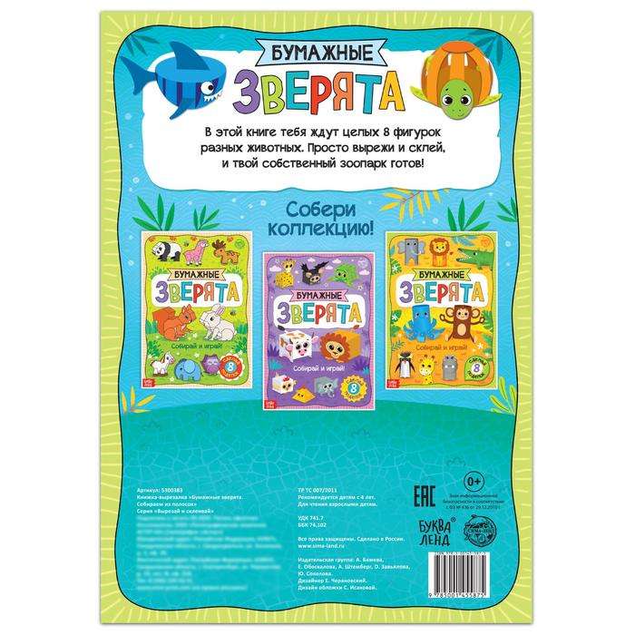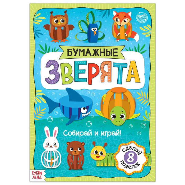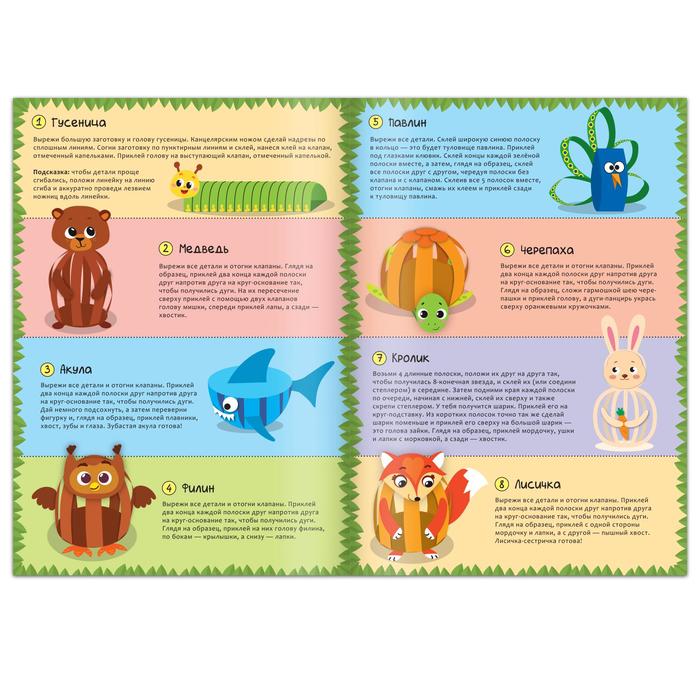 Внутри книги вы найдёте 8 заготовок для создания фигурок животных. Нужно просто вырезать детали и склеить между собой.