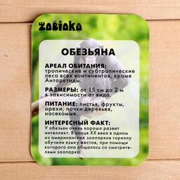 Развивающий набор с животным и обучающей карточкой создан для малышей от 3 лет. Он познакомит кроху со обезьянкой. Малыш узнает о местах обитания животного, размерах, способах питания и удивительных фактах.